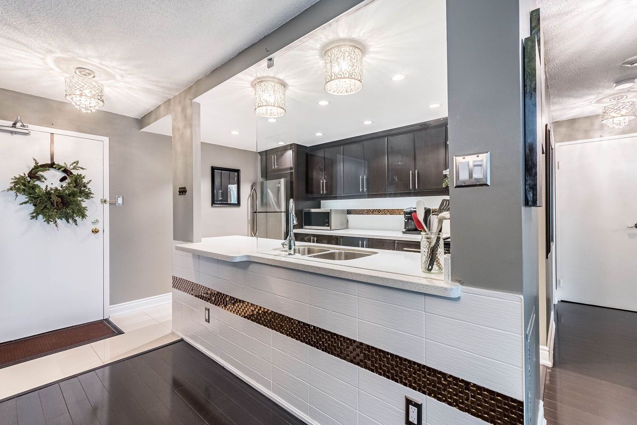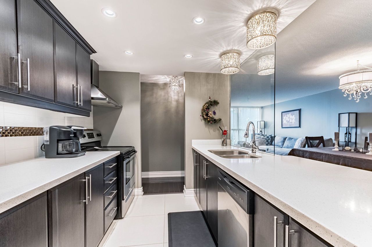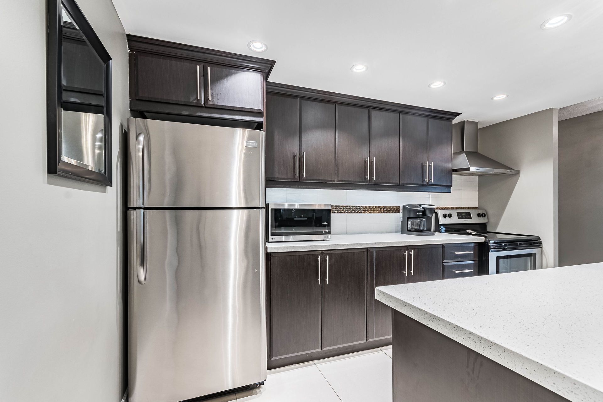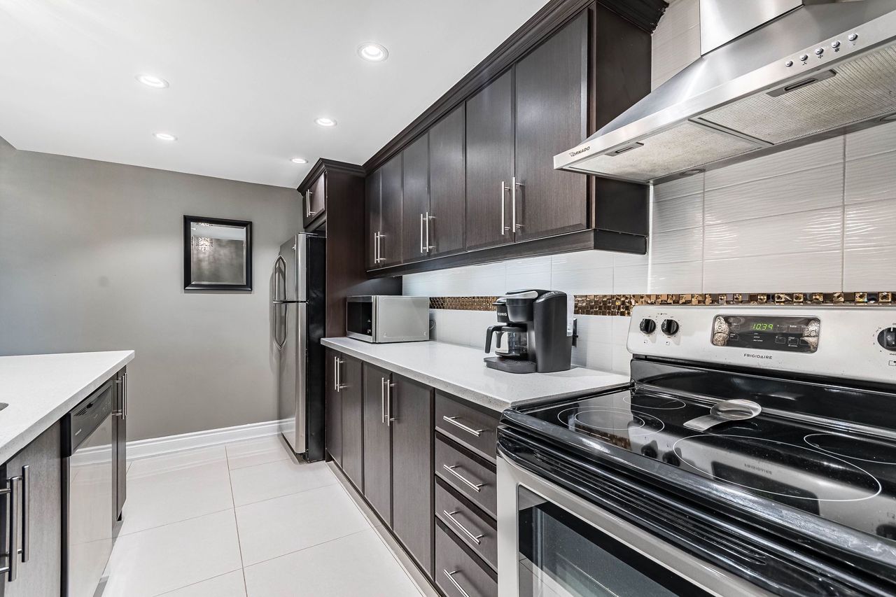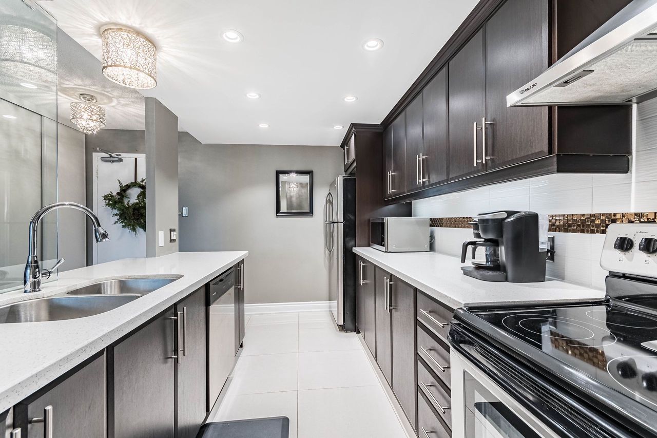 Kitchen With Dark Cabinets, Quarts Counters, S/S Appliances, Ceramic Backsplash & Pot Lights. Close