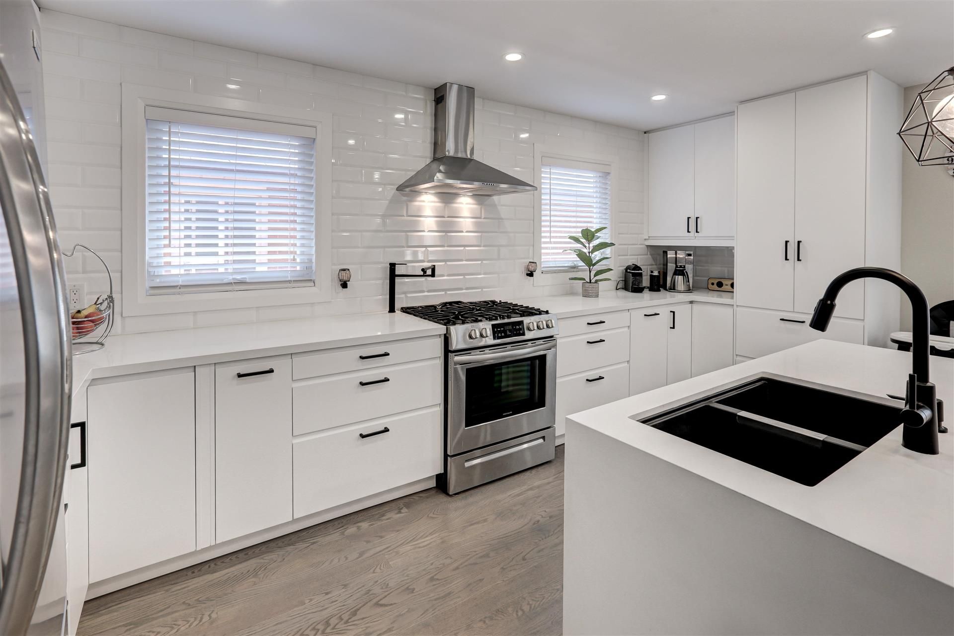 This stunning home is move-in ready with all the upgrades you could want! Enjoy a modern interior with newer windows, doors, and trim. The updated exterior includes updated soffits, eaves, and roof.The backyard features exposed aggregate concrete, a gazebo, shed, and natural gas BBQ hookup. For energy efficiency, newer furnace, tankless hot water heater, and A/C (all owned), plus R-60 attic insulation. Control your lighting and garage door opener from your phone. Inside, you'll find custom hardwood floors and a sleek kitchen with quartz countertops and a waterfall island. The fully finished, above-ground basement is perfect for entertaining and has an additional kitchen, making it ideal for rental income.Sound barrier between floors, custom flush mount hardwood air vents for a seamless aesthetic, high-end Panasonic exhaust fans in all bathrooms for efficient ventilation, pasta pot filler in the main kitchen for added functionality.