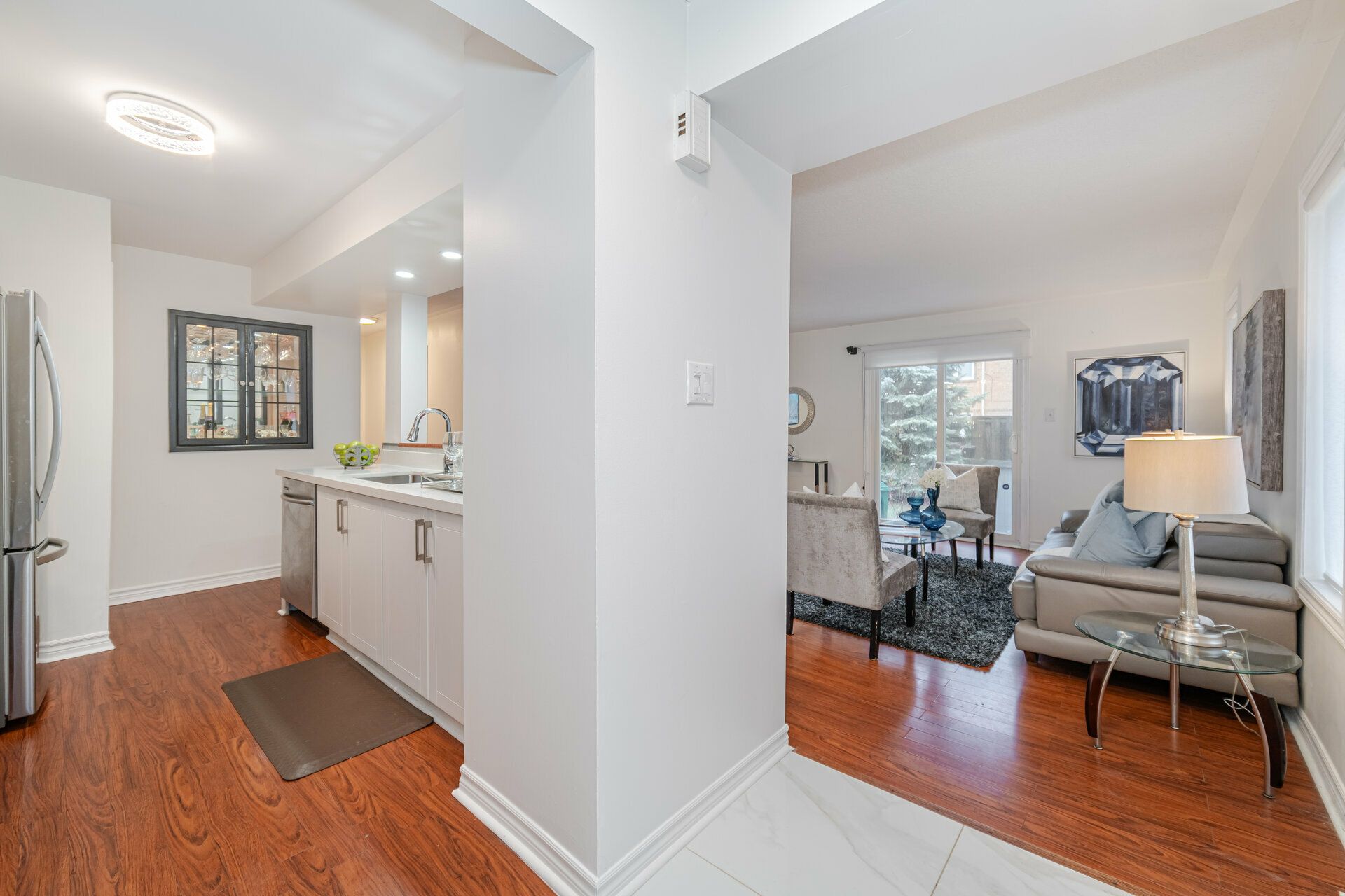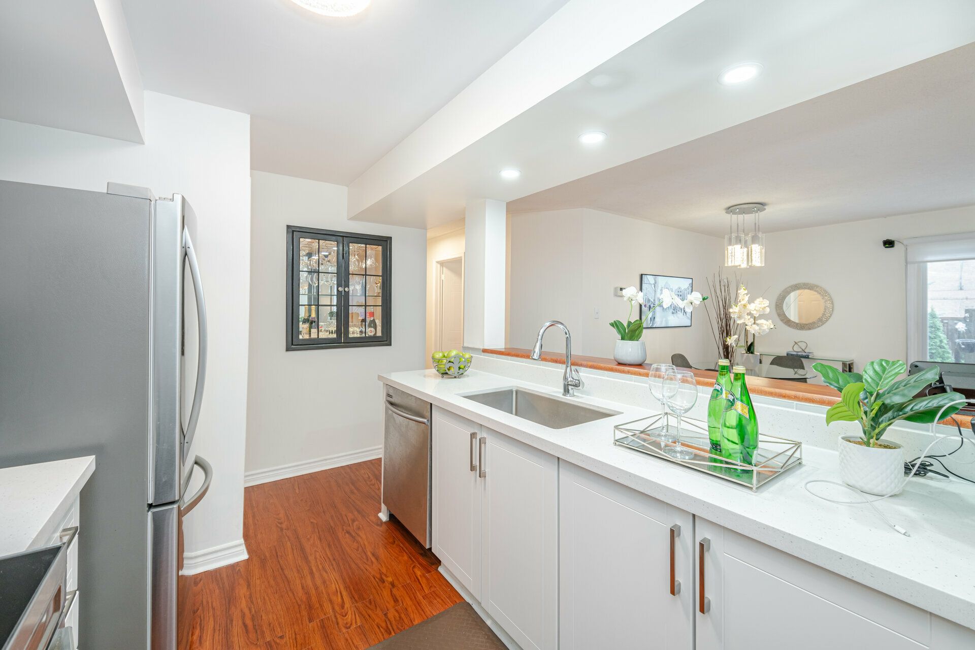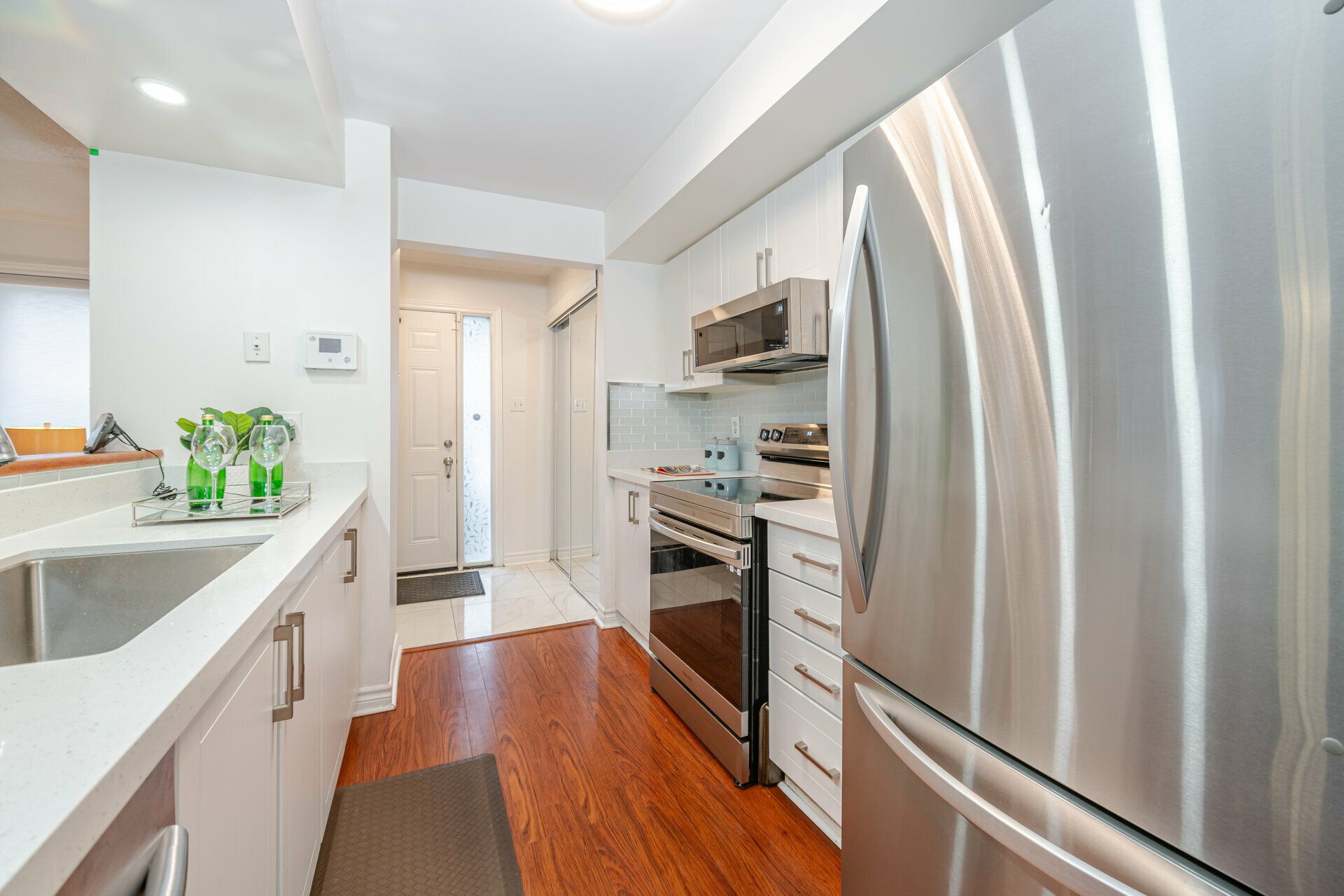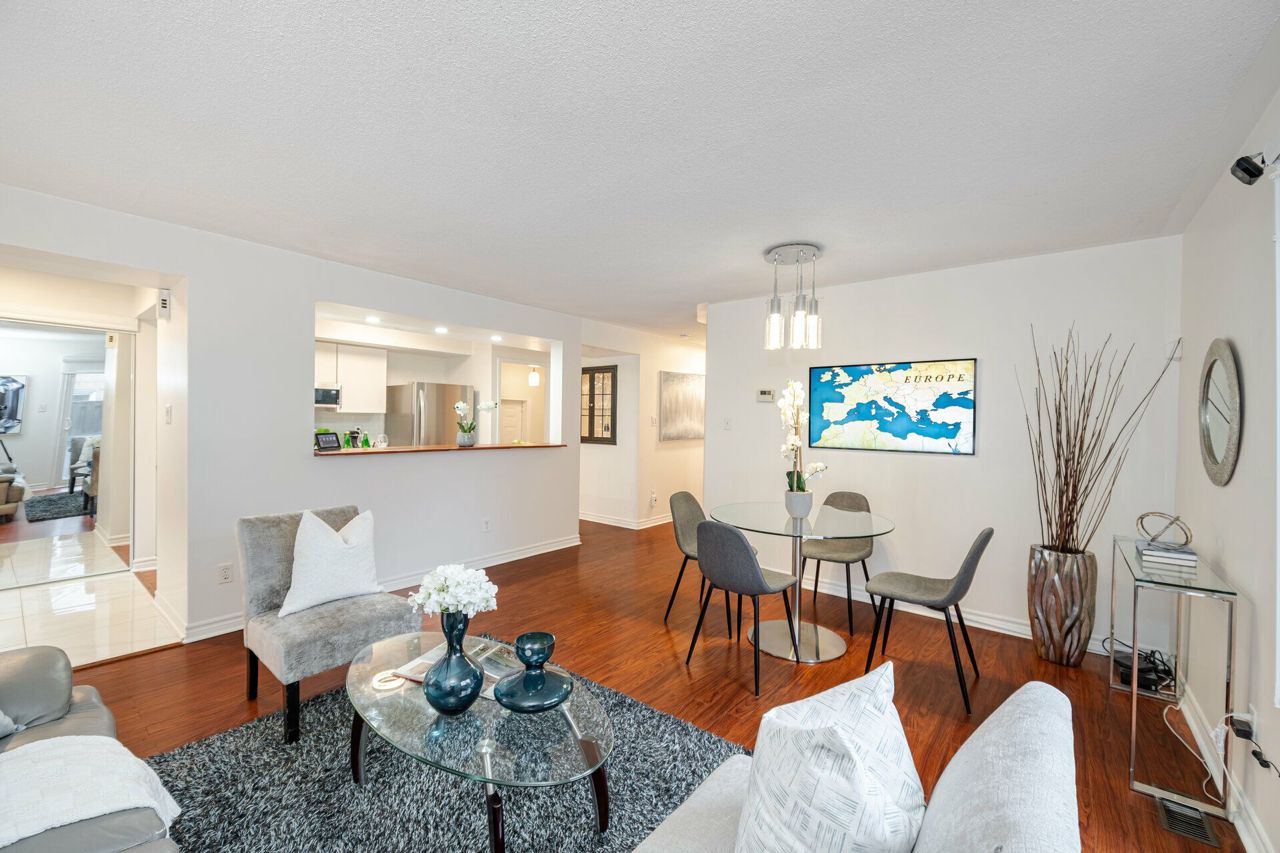 Beautiful upgraded bungalow style 2+1 condo townhome end/corner unit ( stacked townhome) approx 1500 sqft living space ( main level plus bsm w/ office) w/ modern kitchen, quartz countertop, 2 yr old S/S Appliances ( Fridge, Stove, B/I Microwave w/Exhaust & Dishwasher) newer Washer , Dryer ; 2 fully renovated washrooms , This condo townhome is nestled in the Hurontario and Bristol Rd Community, next to future LRT line and features laminate flooring, open concept layout,living room walk out to patio, finished bsmt w/ renovated 3 pc shower ,2 car parking & separate entrance from garage; Great Location! Steps to transit, walk to one of the very good schools (St Francis Xavier Secondary , Elementary Catholic w/ extended french school & public schools; Steps away from Sandalwood Plaza w/ Mcdo, Banks, Salons, etc, Close to Frank McKechnie Community Centre, Square One Mall, place of worship, 403 & 401 Hiways & Highland Farms & Oceans Asian Food Store;S/S Appliances ( 2 yr old fridge, stove, B/I dishwasher, B/I microwave), washer,dryer; reno modern kitchen, quartz countertop, reno washrooms, separate entrance from garage to main & bsmt; All electrical fixtures, window coverings ;