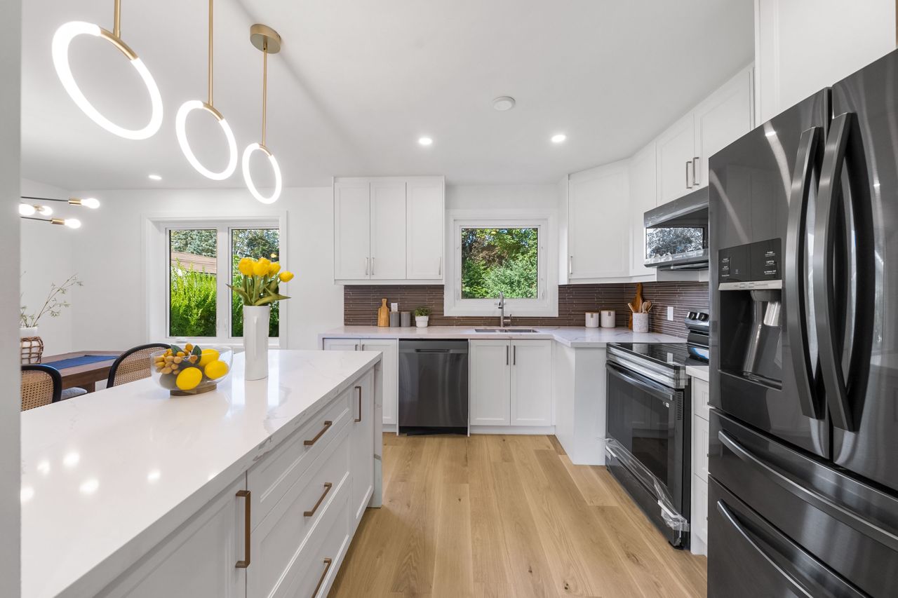 The Backyard Is Spacious, and all Windows Offer Stunning Views of Both the Back and Front Yards on the Main Floor. The Renovation Includes a Beautifully Updated Kitchen With Quartz Countertops ('23) For Both Kitchens, New Wood Flooring ('23), Basement Vinyl Flooring ('23) Renovated Bathrooms ('23), Separate Laundries, Upgraded Light Fixtures ('23), Pot Lights ('23) All Interior Doors ('23), Freshly Painted ('23) Well-Designed Foyer ('23), New Furnace & A/C ('23) Spacious Rec Room in the Basement