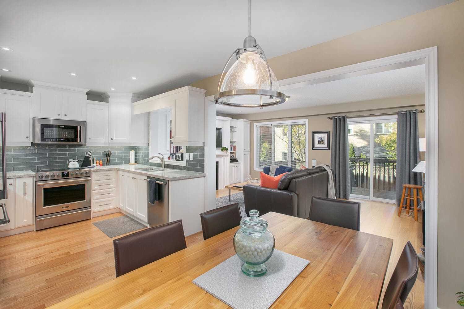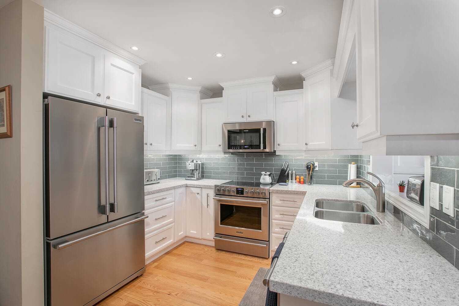 Eat-In Kitchen Stone Counter Hardwood Floor