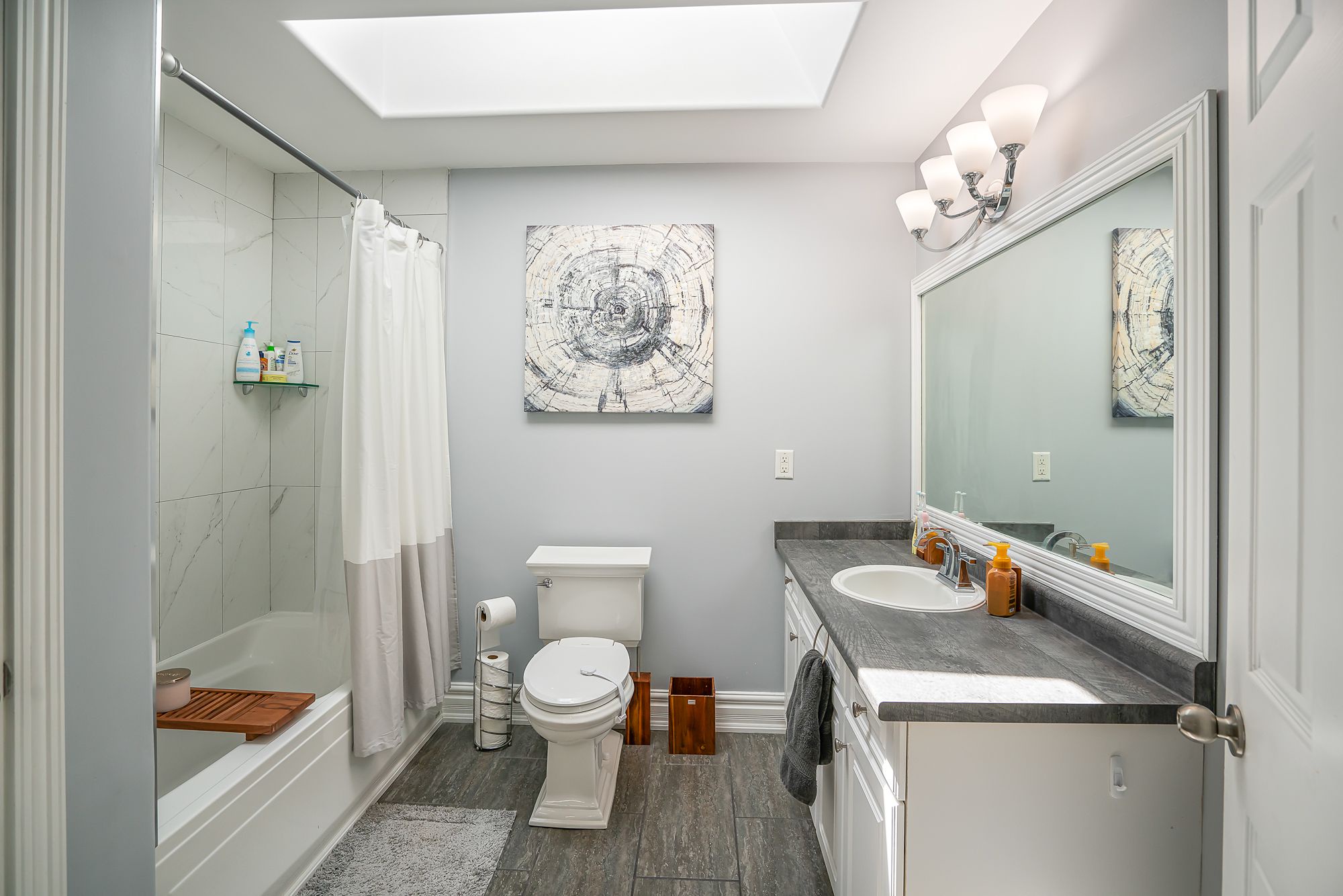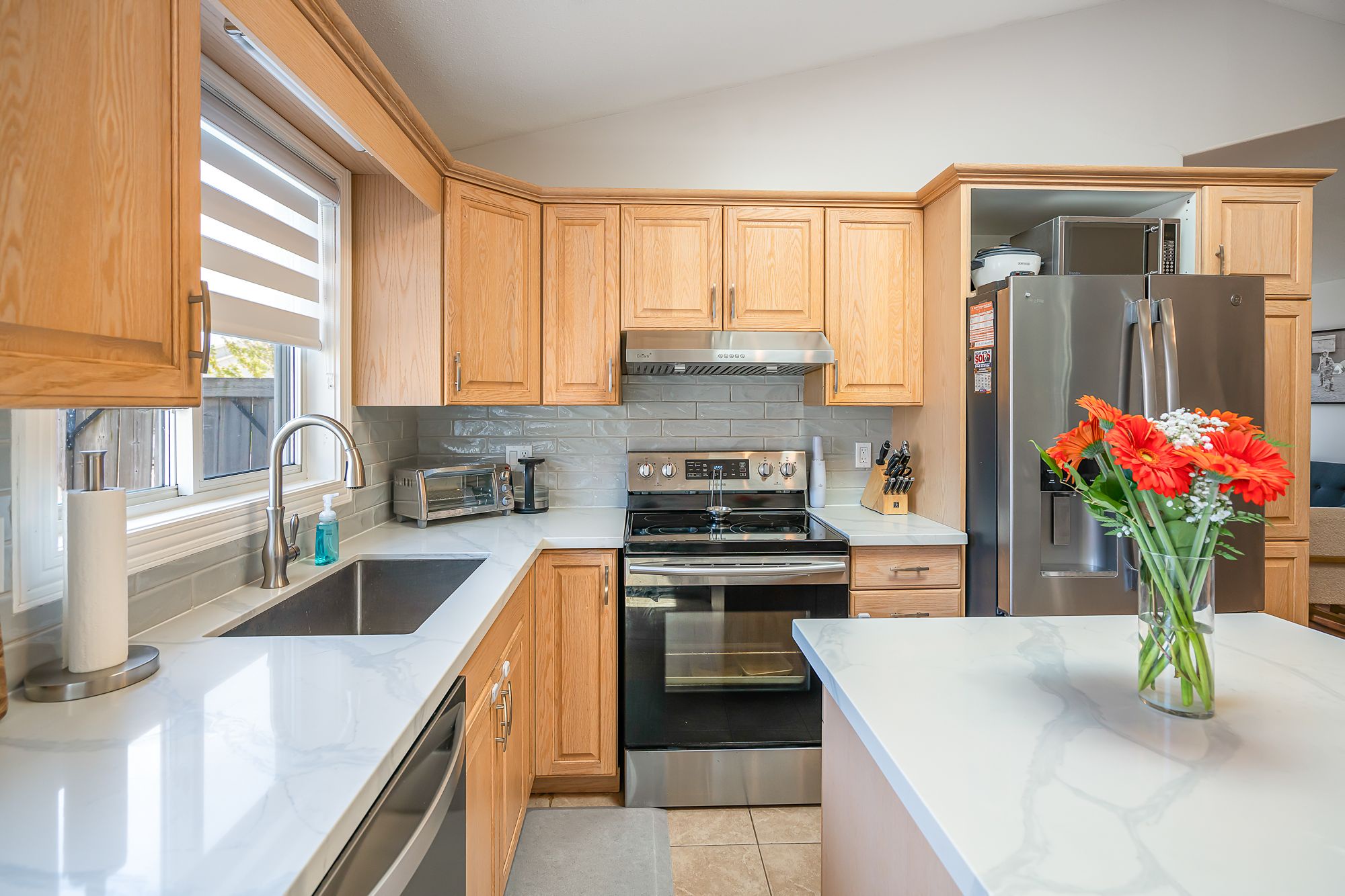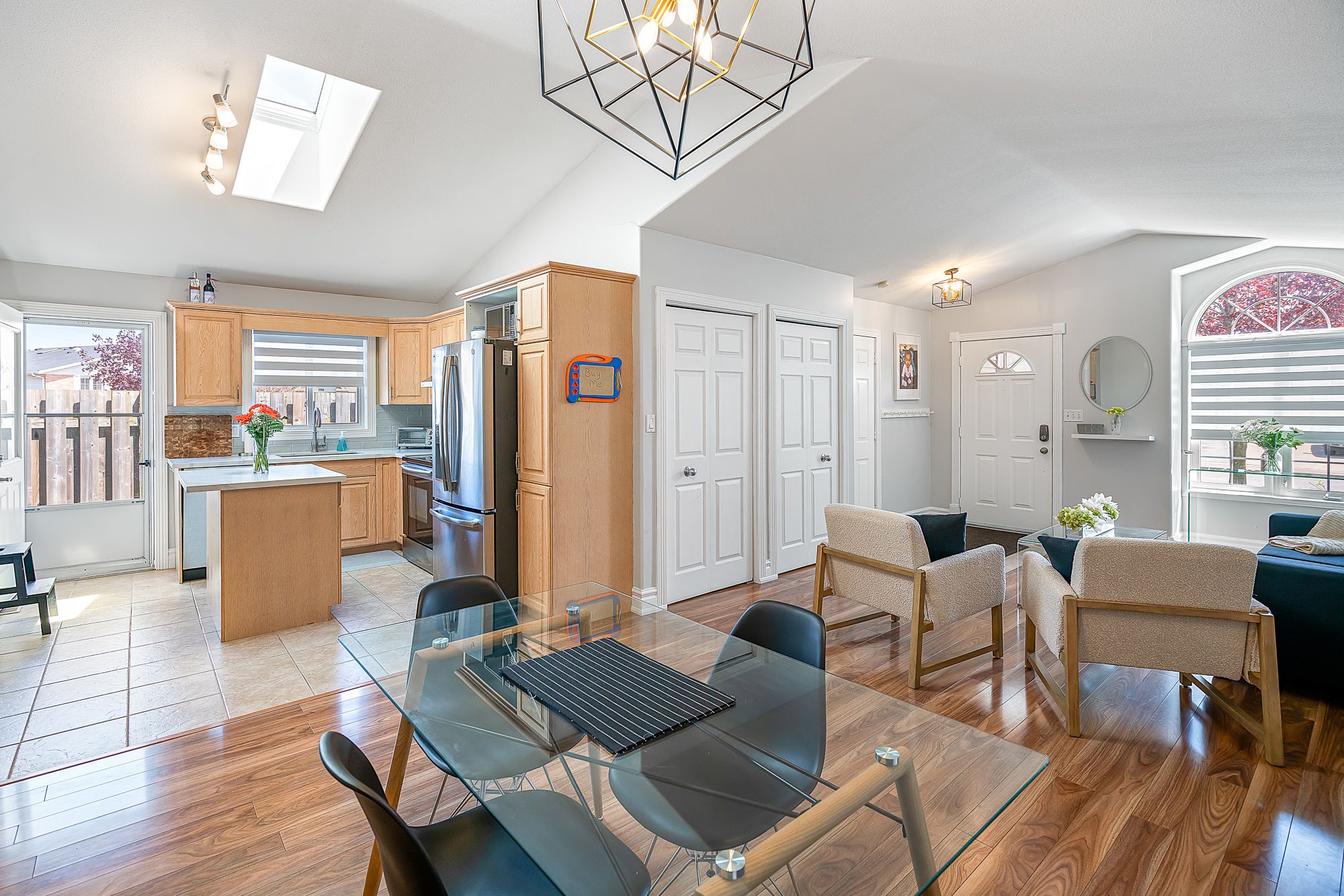 Welcome to this beautifully maintained 4-level backsplit located in a desirable north Niagara Falls neighbourhood, just minutes from the Thorold Stone exit of the QEW. This spacious 3-bedroom home offers an open-concept main level with vaulted ceilings, seamlessly connecting the living room, dining area, and modern kitchen. The kitchen features stunning quartz countertops, a functional island, stainless steel appliances, and is bathed in natural light thanks to skylight. Step down to the expansive family room, complete with a cozy gas fireplace perfect for entertaining or relaxing evenings. The home also offers convenient inside entry from the attached garage. The fully fenced backyard is ideal for outdoor living, featuring a large deck that spans the entire rear of the home. Bright, stylish, and move-in ready, this home checks all the boxes for comfortable family living in an ideal location.
