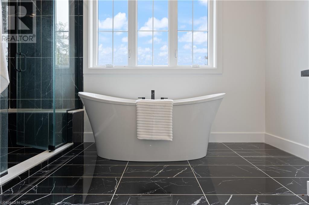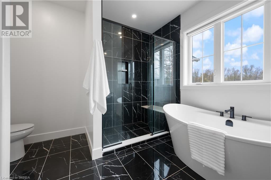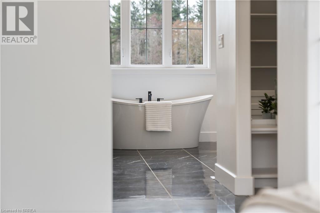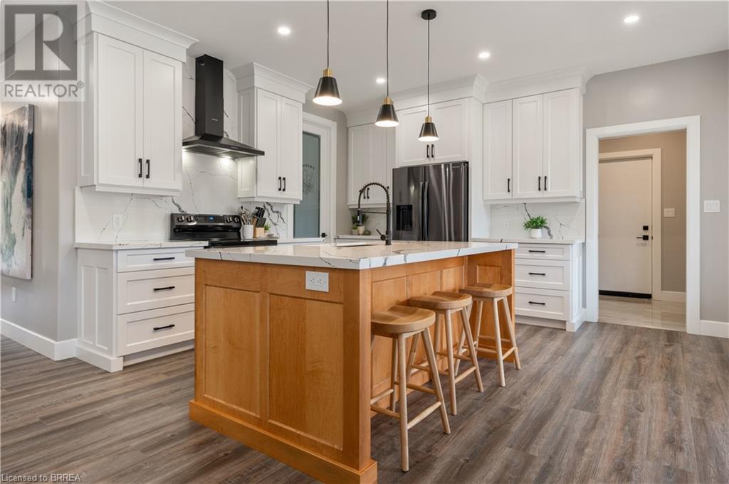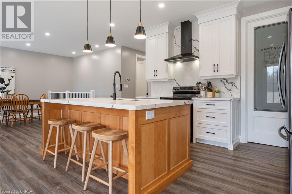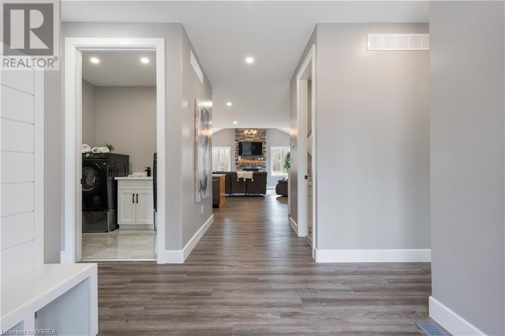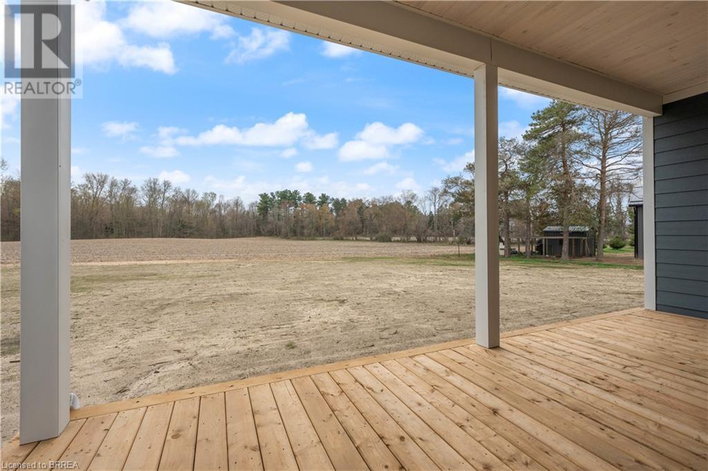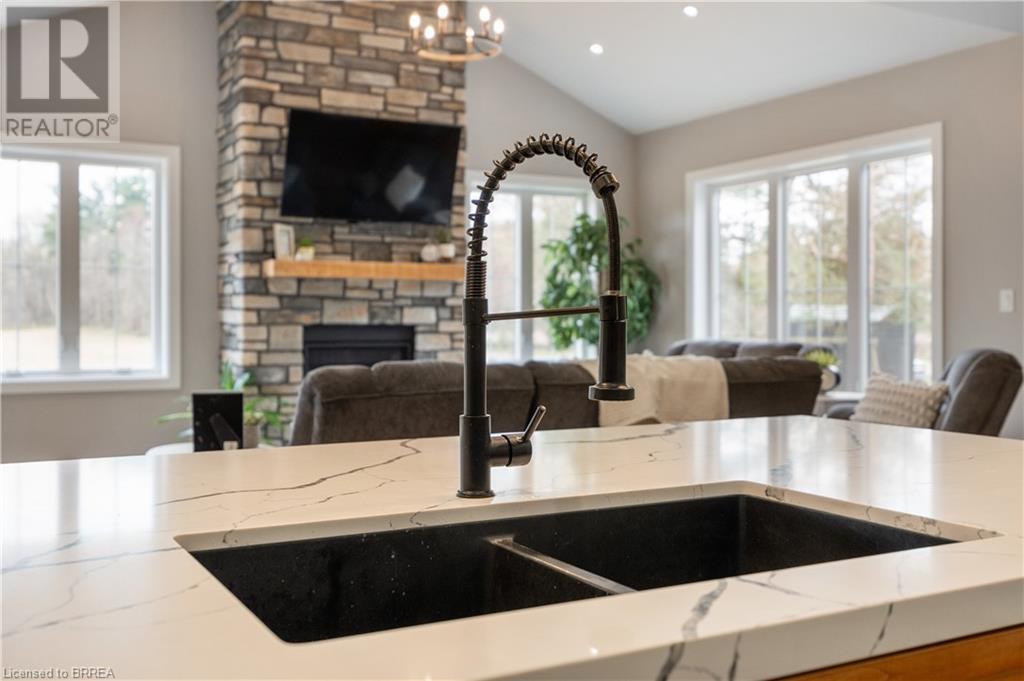 This eye-catching property will immediately capture your attention, situated on 0.83 acres and boasting a serene rural setting that should not be missed. Leading you to the entrance of this home is a brand new semicircular concrete driveway completed in April 2023. Inside, a spacious foyer welcomes you, showcasing modern design and high-quality upgrades throughout. The family room features a vaulted ceiling and a stylish floor-to-ceiling gas fireplace that serves as the focal point of the room, surrounded by windows and a sliding door, natural light floods this space. An open-concept layout with hand-scraped vinyl plank flooring connects the family room to the dining area and kitchen, where extended cabinets reach up to beautiful crown mouldings while the stone countertops continue up the backsplash, creating a luxurious and polished look. The kitchen also features a large walk-in pantry and an elegantly designed island with breakfast bar, completing the kitchen to perfection. Moving further into the home, the primary bedroom is bathed in light and guides you into the spa-like ensuite with exquisite modern tile, double closets, an enclosed glass shower, and a freestanding tub. The unfinished basement with rough-in is ready for your creative ideas to come to life. Other upgrades include an insulated main floor laundry room for quiet laundering and garage in-floor heating and re-line. Outside, you can relax and enjoy the peacefulness of this exceptional property and kick back on the 20x14 covered back porch, featuring tongue and groove construction. This home will be hard to beat, so don't miss your chance to call it home. (id:22211)