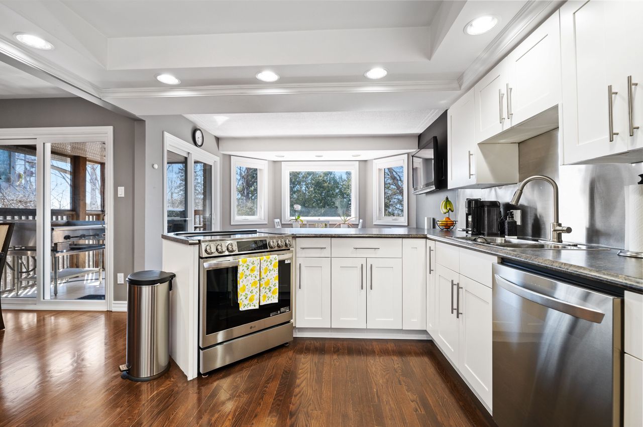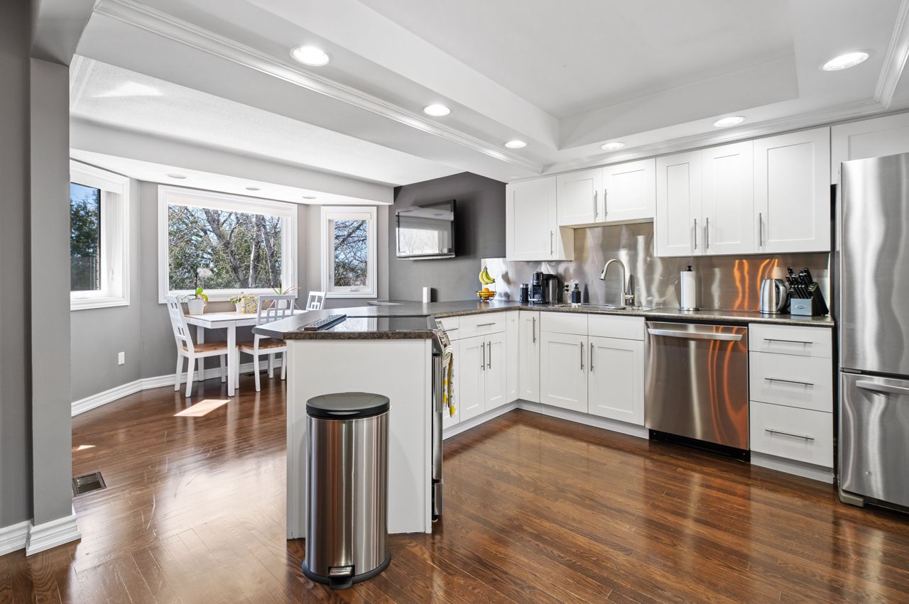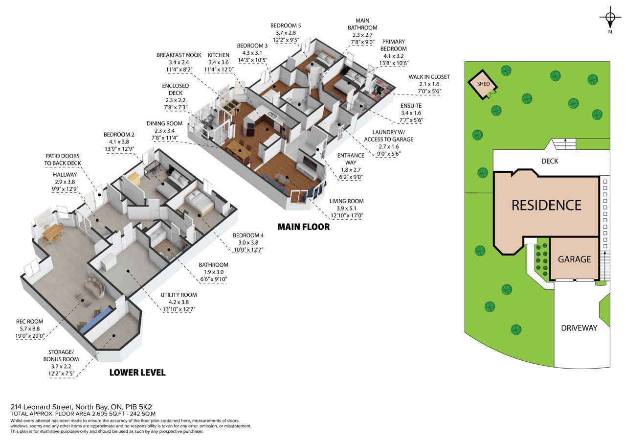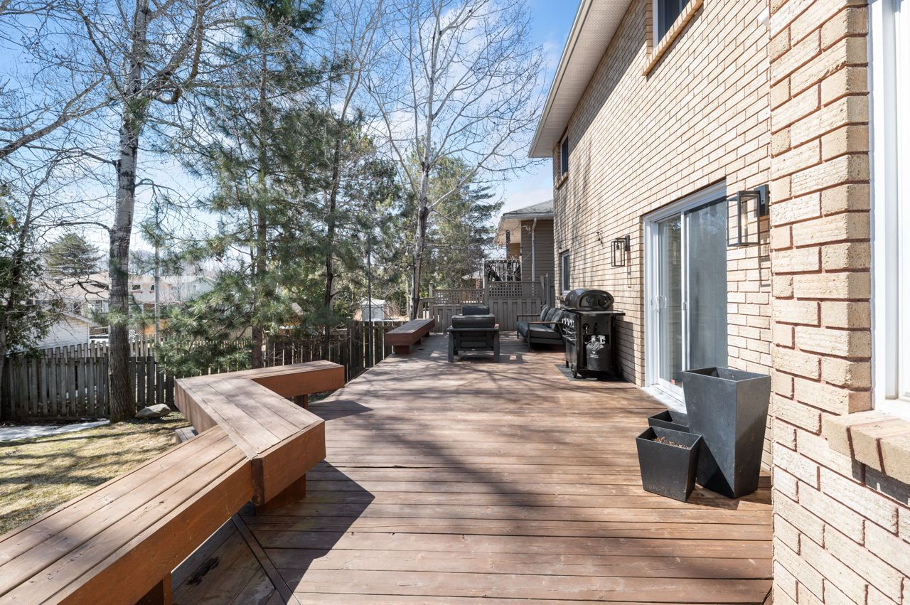 214 Leonard Street Spacious Walk-Out Bungalow with a Great Backyard. This bright and inviting walk-out bungalow offers elegant living in a prime location. The home welcomes you through a stylish entrance with tile flooring and a convenient hall closet leading to an open and well-designed main level. The kitchen shines with a pantry wall, a breakfast nook overlooking the backyard, and a dining area that flows seamlessly into the enclosed deck perfect for barbecues or enjoying summer breezes. The adjacent living room completes this ideal space for entertaining and everyday comfort. Three bedrooms grace the main floor, including a primary suite with a walk-in closet and an updated ensuite bathroom featuring a walk-in shower. The main bathroom offers relaxation with its jacuzzi tub, while hardwood floors throughout the living spaces add warmth and character. Practical touches include a laundry room with direct access to the double attached garage. The impressive finished basement surprises with high ceilings and abundant natural light. This versatile lower level features a spacious rec room, two additional bedrooms, a three-piece bathroom with a walk-in shower, and bonus rooms perfect home office or storage. Walk out through patio doors to the back deck and enjoy the peaceful, tree-lined backyard with its handy shed, your private retreat in the city. Located just minutes from the North Bay Regional Health Centre, Nipissing University, shopping centers, and all essential amenities. The manicured yard, brick double driveway, and thoughtful layout make 214 Leonard Street a standout property for those seeking space, comfort, and move-in-ready quality.
