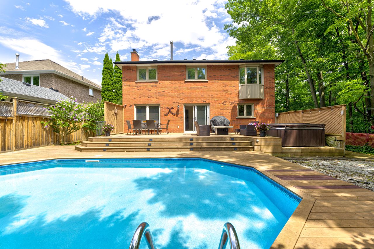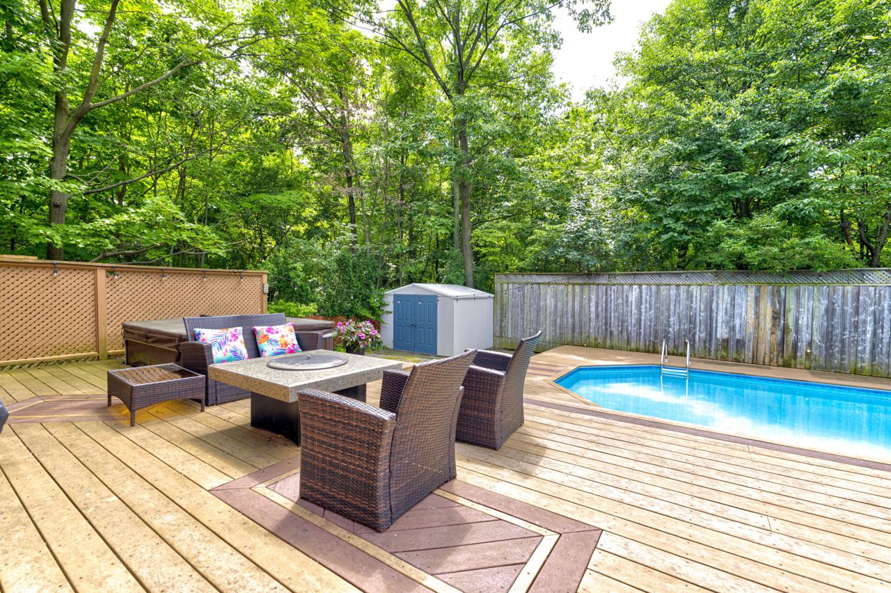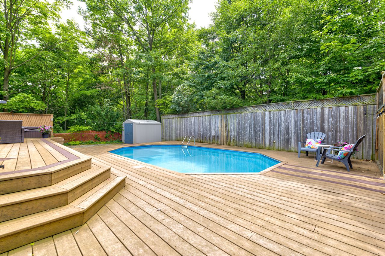 Private Ravine Oasis! No neighbours to the left or rear of this luxury 4 + 2 Bed, 4 +1 bath home. Outside you are surrounded by beautiful forested Oakridge Park. You will love staying home and swimming in the pool, relaxing in the hot tub or on the beautiful low maintenance composite deck. Inside you will enjoy the chef's dream kitchen with solid wood cabinets, some sparkinging glass door cabinets, high-end appliances, granite counters, built-in wall ovens and a massive island. Main floor has hardwood throughout, cozy living room with wood burning fireplace, large dining room, convenient main floor office, 2 piece powder room and mud/ laundry room with side door and garage access. Second floor also has hardwood throughout, huge primary bedroom with double closets, beautifully updated 5 piece bathroom with stand alone soaker tub. There are 3 other good sized bedrooms. One bedroom has updated 3 piece ensuite bathroom and there is a gorgeous updated main bathroom with double sinks and glass shower. The basement is completely finished with spacious family room with gas fireplace. There are 2 more very large bedrooms and a 3 piece bathroom.Step outside and you're right next to a forest walk, running, biking trail. Located in desirable River Oaks neighourhood with top ranked public/ private schools, easy highway access and close to shopping.