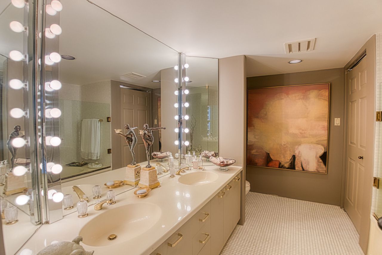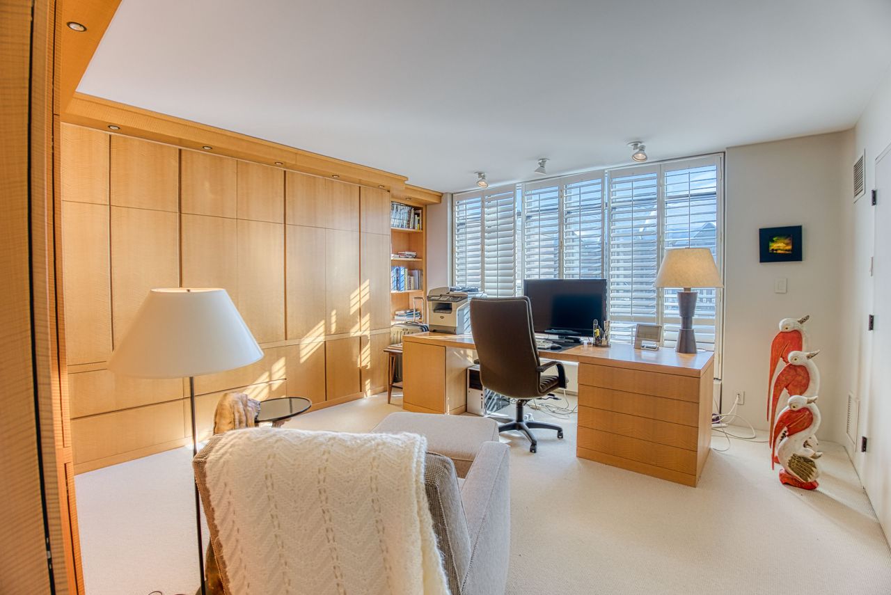 兩間臥室均位於公寓左側,各自配有獨立衛浴。開闊的主臥套房堪稱休憩聖殿,六件套豪華主衛配備深泡浴缸、玻璃淋浴房、雙人盥洗台及智能馬桶。充裕的儲物空間與加裝加州百葉窗的超大觀景窗更添魅力。次臥現用作辦公室,內設帶洗衣功能的五件套衛浴,巧妙設計的門使該衛浴既能服務訪客又可保障臥室私密性,另有嵌入式衣櫃提供充足收納。