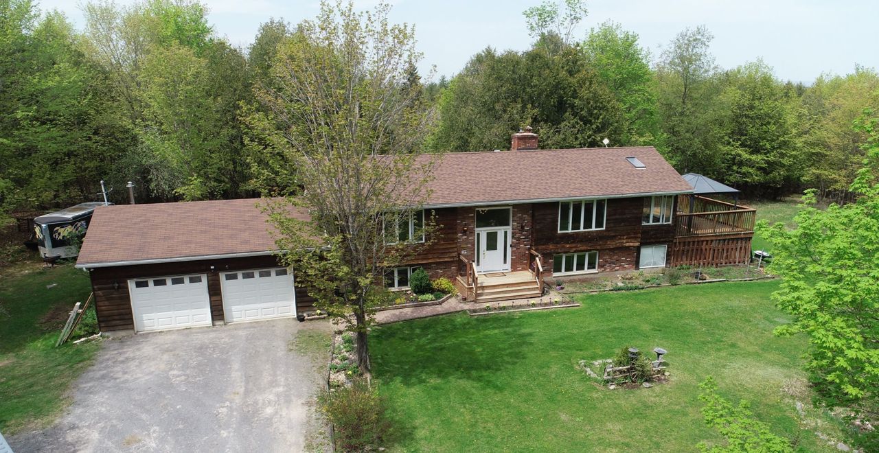 Acreage with Home & Small Barn! Welcome to the tranquil retreat of Rocky Acres, where you'll find the perfect blend of nature and privacy. Nestled on 17.7 acres in the peaceful and serene area of Rural Carp, this property offers a secluded escape from the hustle and bustle of everyday life and is located on a quiet cul-de-sac. A charming, Brick & Rustic Cedar, 2+2 Bedroom, 2 Bath Hi-ranch Bungalow complements this incredible property featuring a two-car attached heated garage with 10' ceilings and handy basement access, a sunroom overlooking the deck and side yard for lounging, two brick fireplaces, spacious living & dining rooms boast engineered hardwood floors and sliding glass door to the sun room with cathedral ceiling & wall of windows perfect spot for dining, unwinding or sipping morning coffee and enjoy the beauty of your surroundings ; rich, solid oak kitchen with brick accent wall, large Primary Bedroom with walk-in closet & deep linen closet & lovely main bath with double sink vanity. Lower Level has walkout and access to garage with insulation under concrete floor for added comfort; the walkout from the family room leads to a storage area under the sun room & then to the outdoors, 2 bedrooms (one currently used as storage), a bathroom with shower, separate laundry room with cold storage, a roomy workshop and a walk-in closet at the garage entrance. This property provides the perfect blend of rural charm and modern comforts close by in the city. Come and enjoy your own walking trails through the forested acreage . Lots of potential with the 17' x 25' log barn with loft and hydro, perfect for your barnyard animals for hobby farm potential, storage, creative projects or running your small business! Propane furnace & c/air 2019 approx. & garage shingles approx. 2013 & house shingles approx. 2015. Truly a hidden gem! Act now!
