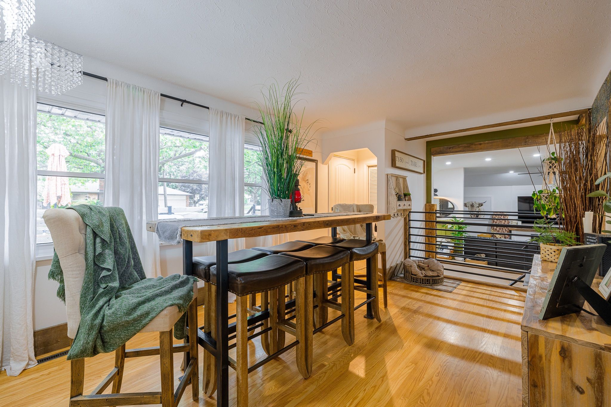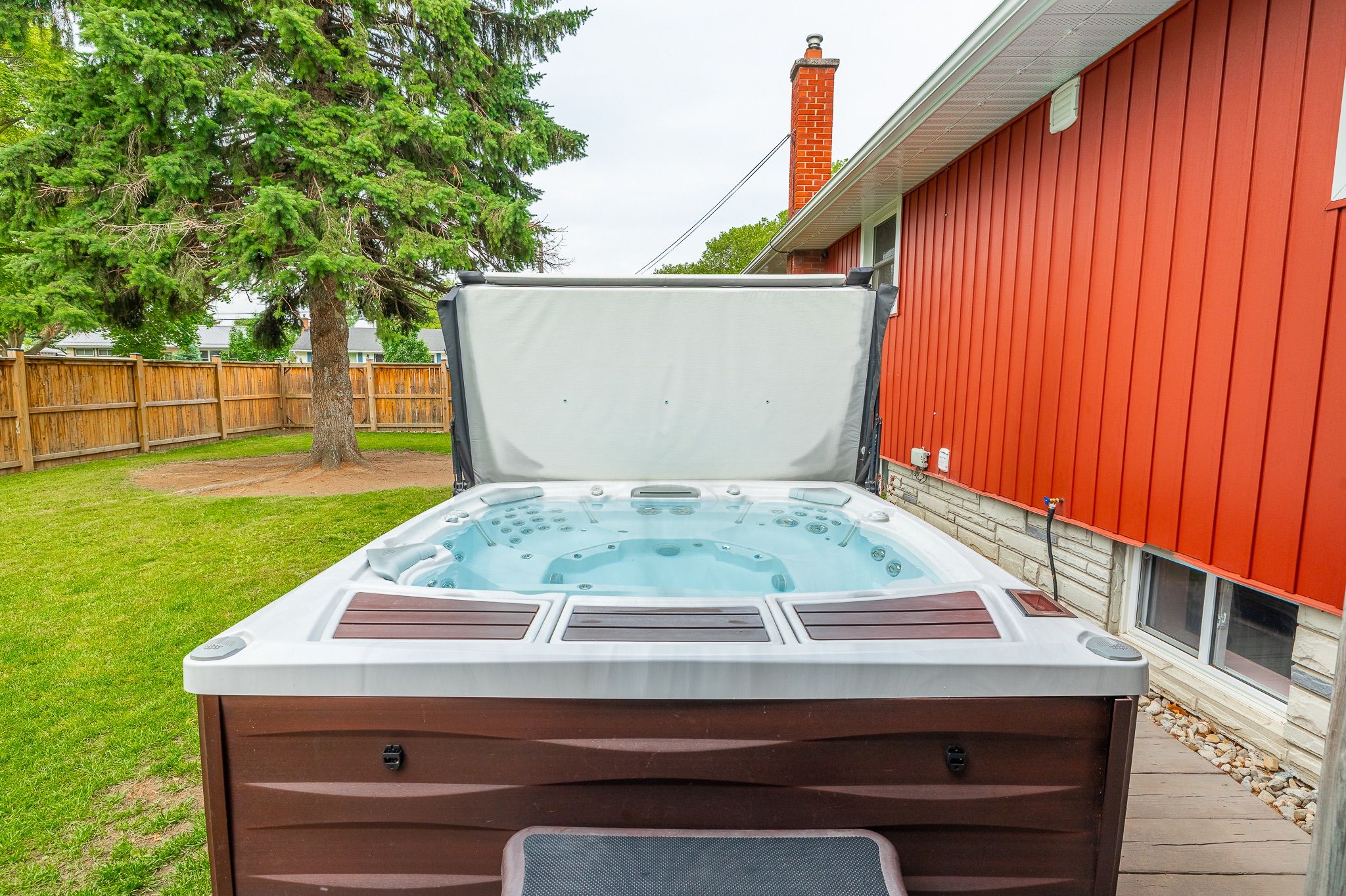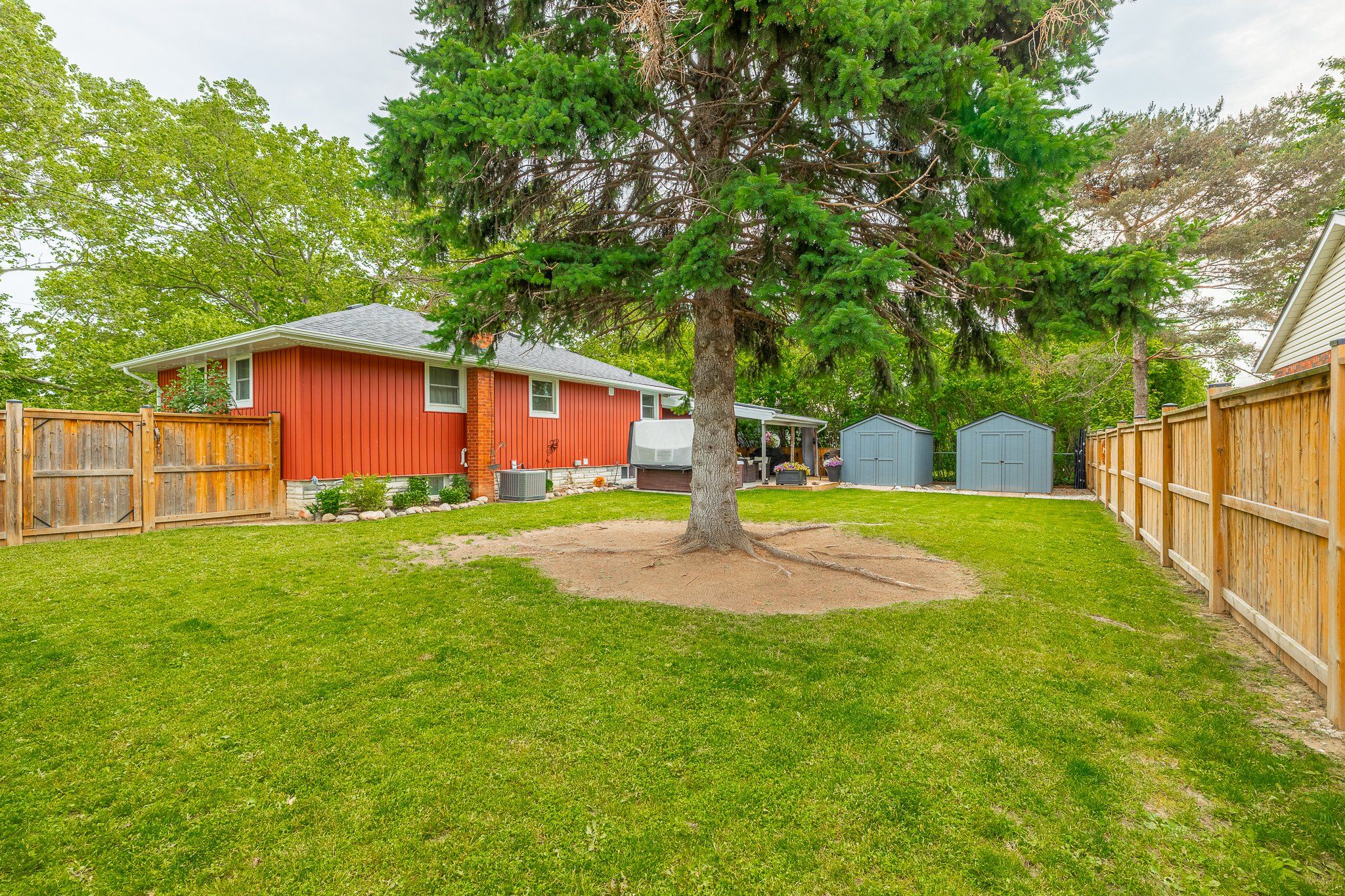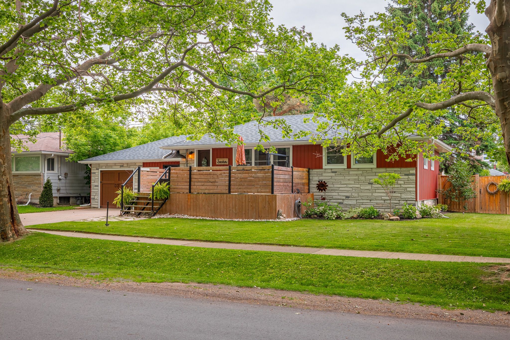 This unique corner lot bungalow, set on a charming tree-lined street, features a unique living space. The former garage has been converted into a living space featuring 13+ foot ceilings. Fully updated in 2020, this home offers a blend of comfort and style. Enjoy evenings in the hot tub or host gatherings on the private covered deck, with a spacious, fully fenced backyard. The property includes two large sheds for storage and is conveniently located near grocery stores, shopping, and outdoor activities!