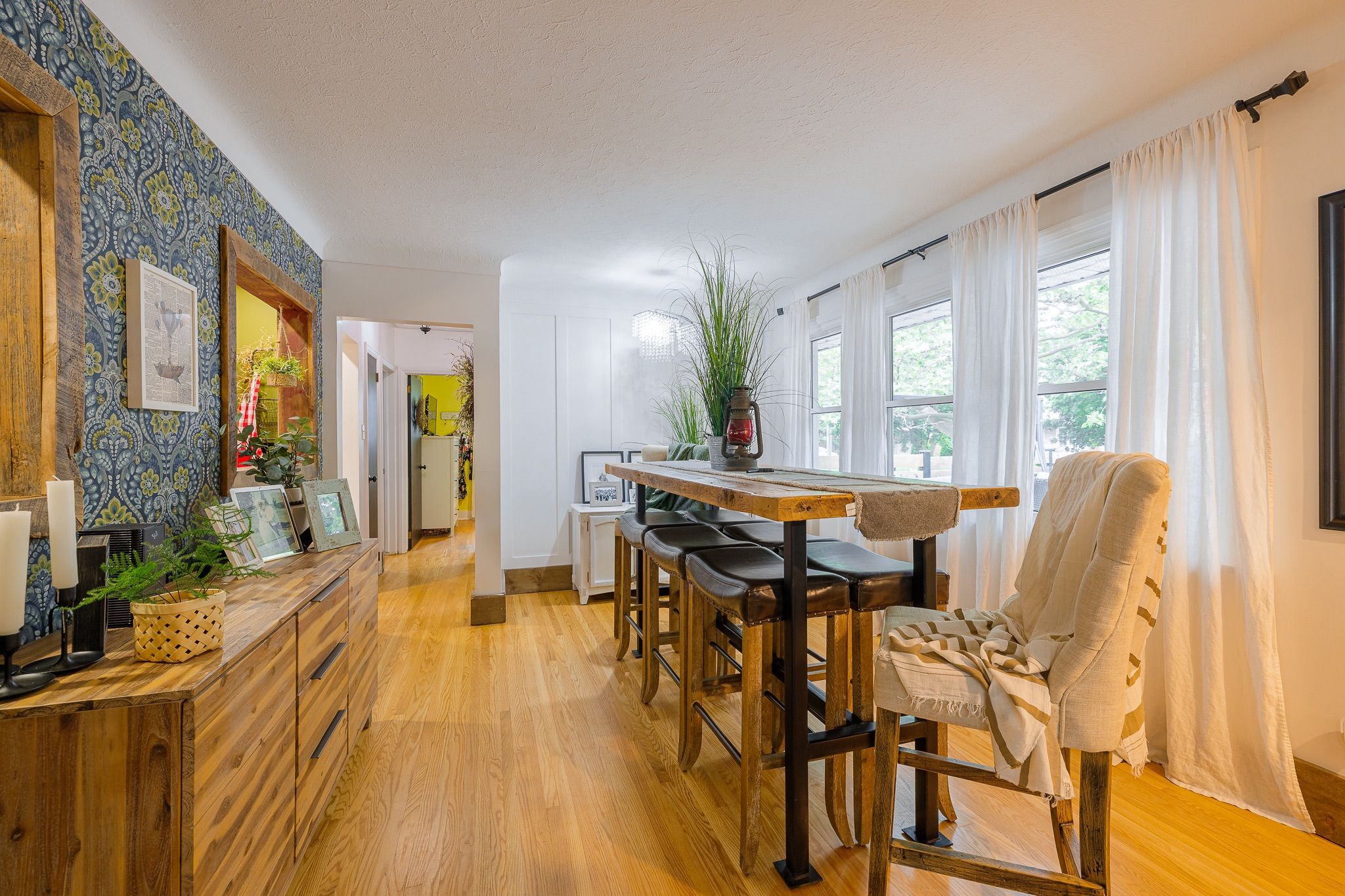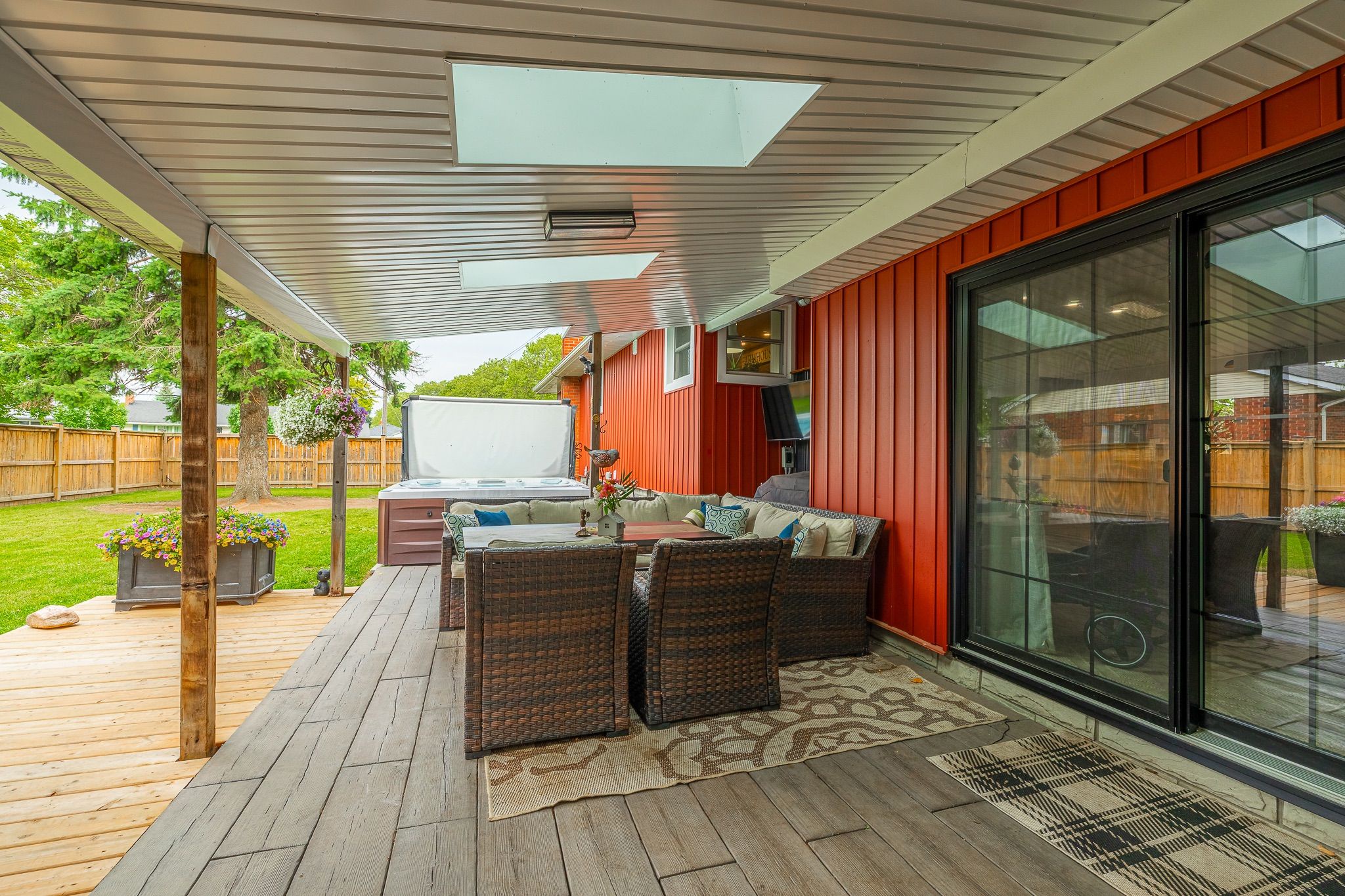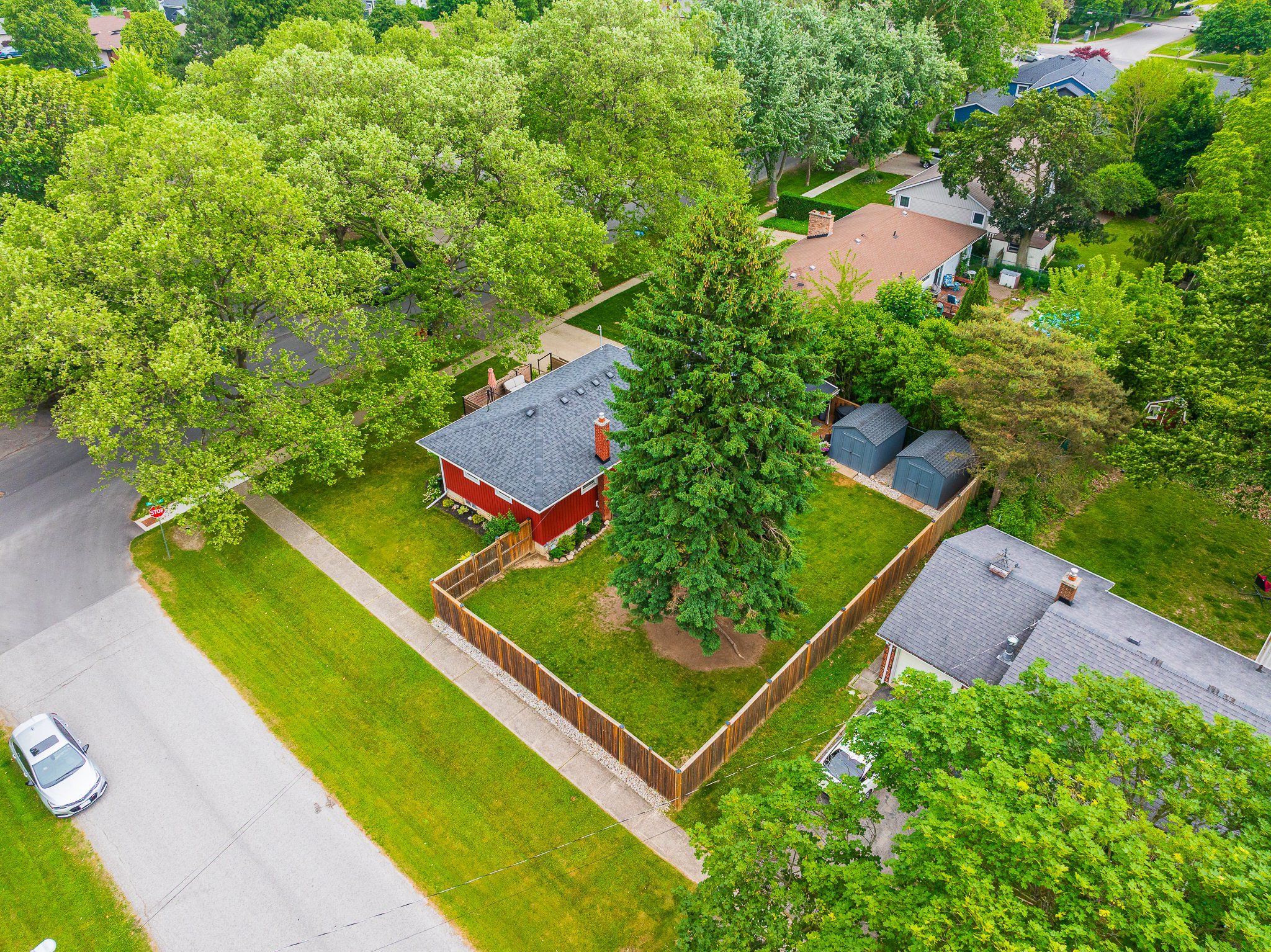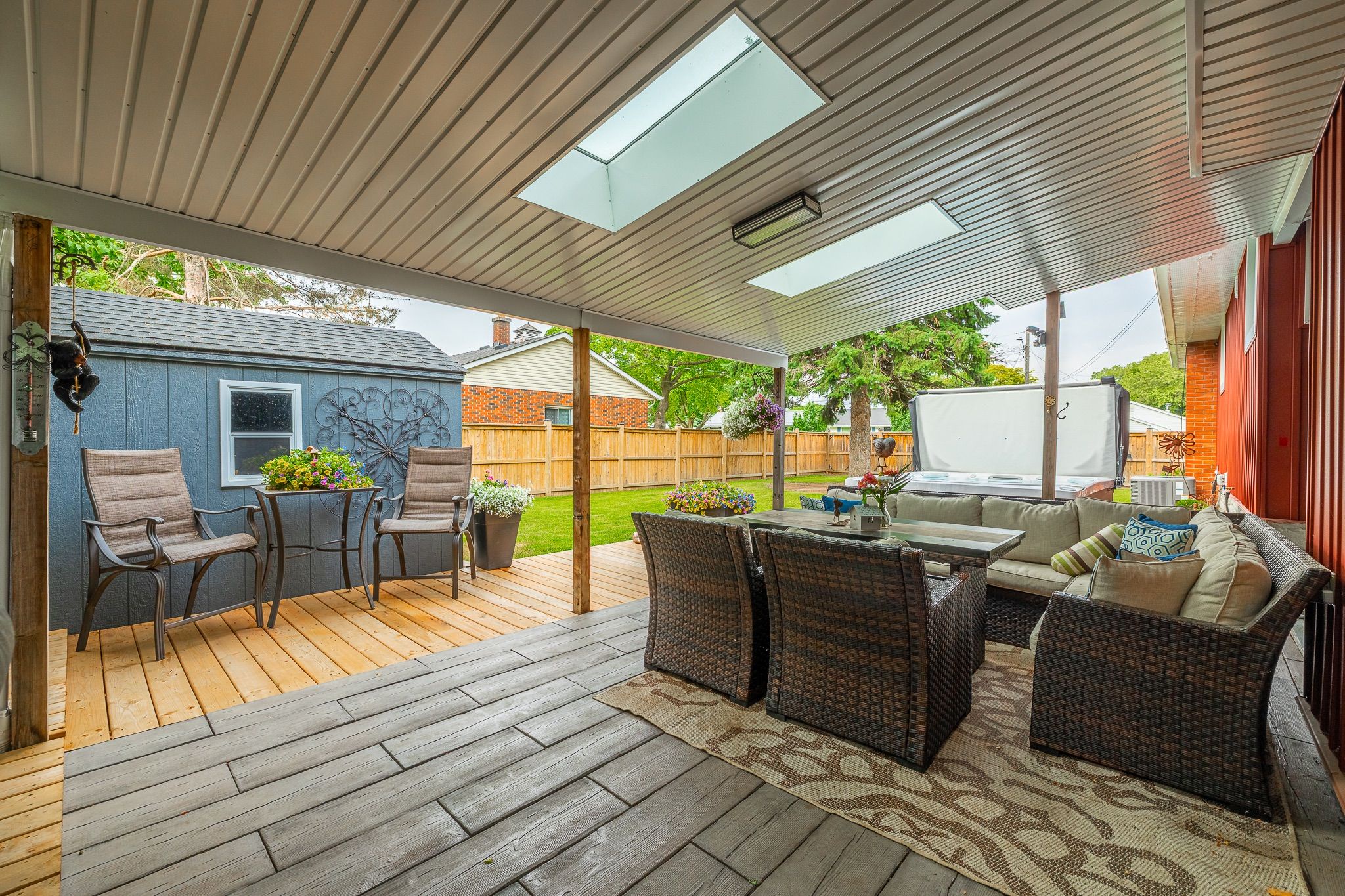This unique corner lot bungalow, set on a charming tree-lined street, features a unique living space. The former garage has been converted into a living space featuring 13+ foot ceilings. Fully updated in 2020, this home offers a blend of comfort and style. Enjoy evenings in the hot tub or host gatherings on the private covered deck, with a spacious, fully fenced backyard. The property includes two large sheds for storage and is conveniently located near grocery stores, shopping, and outdoor activities!
