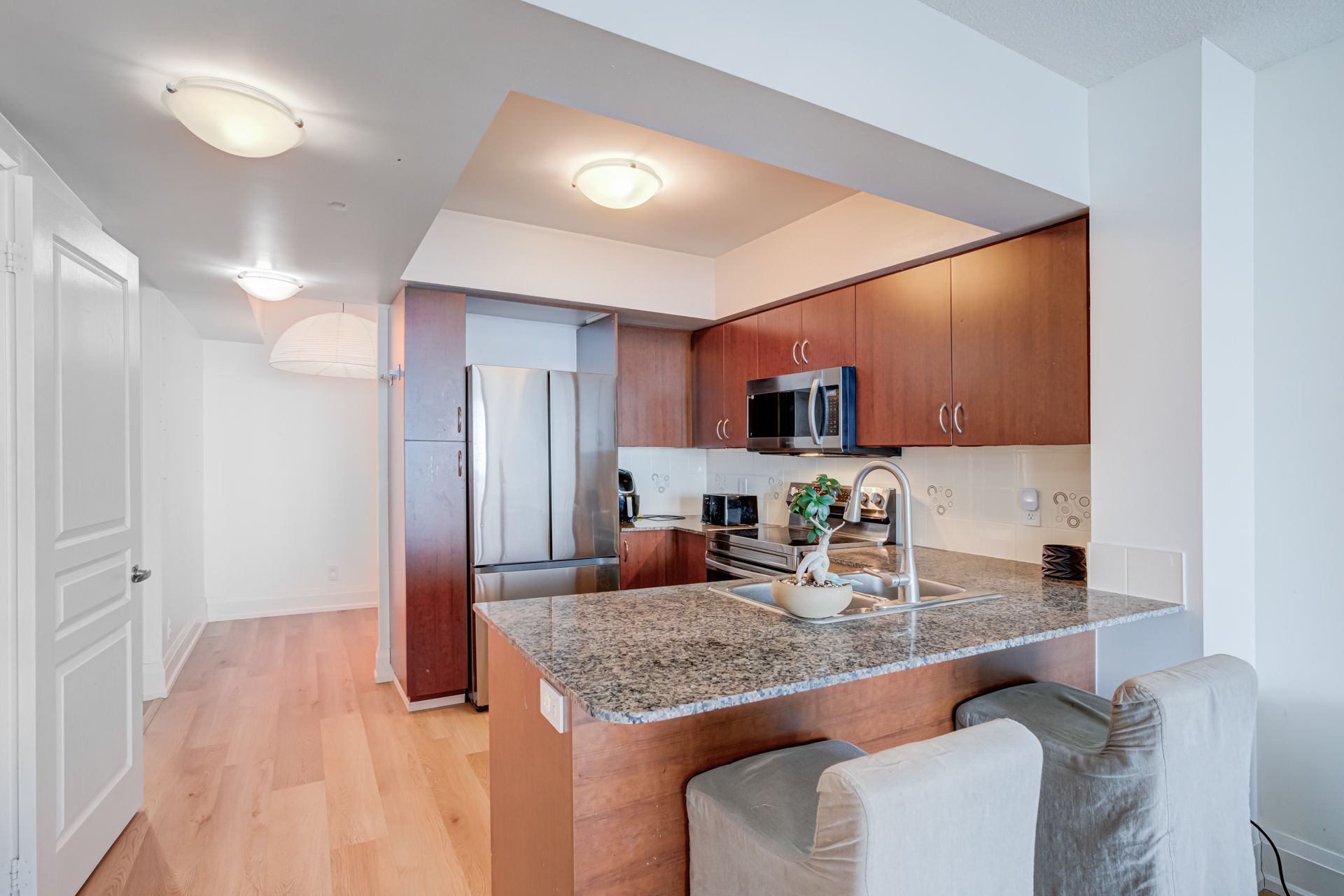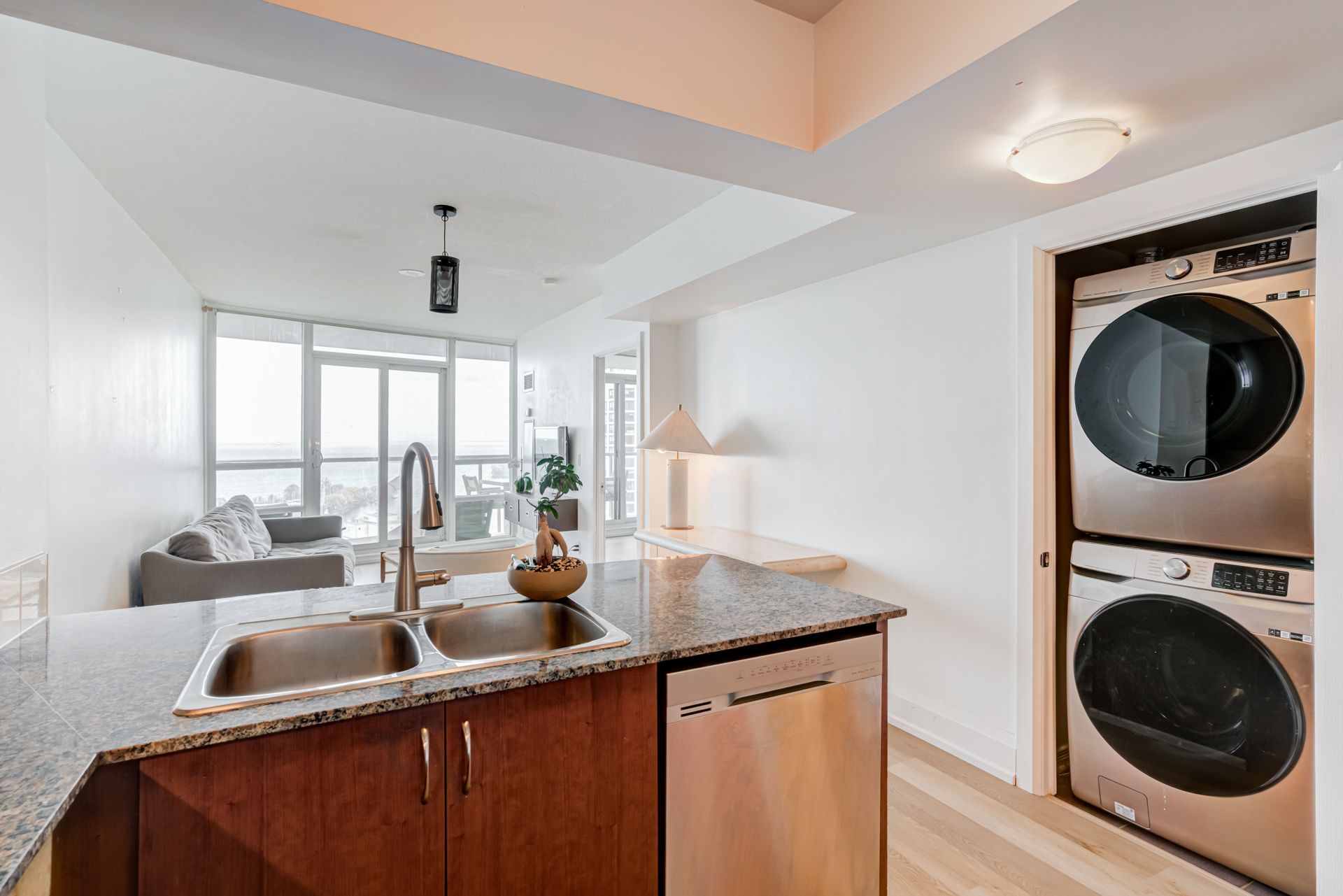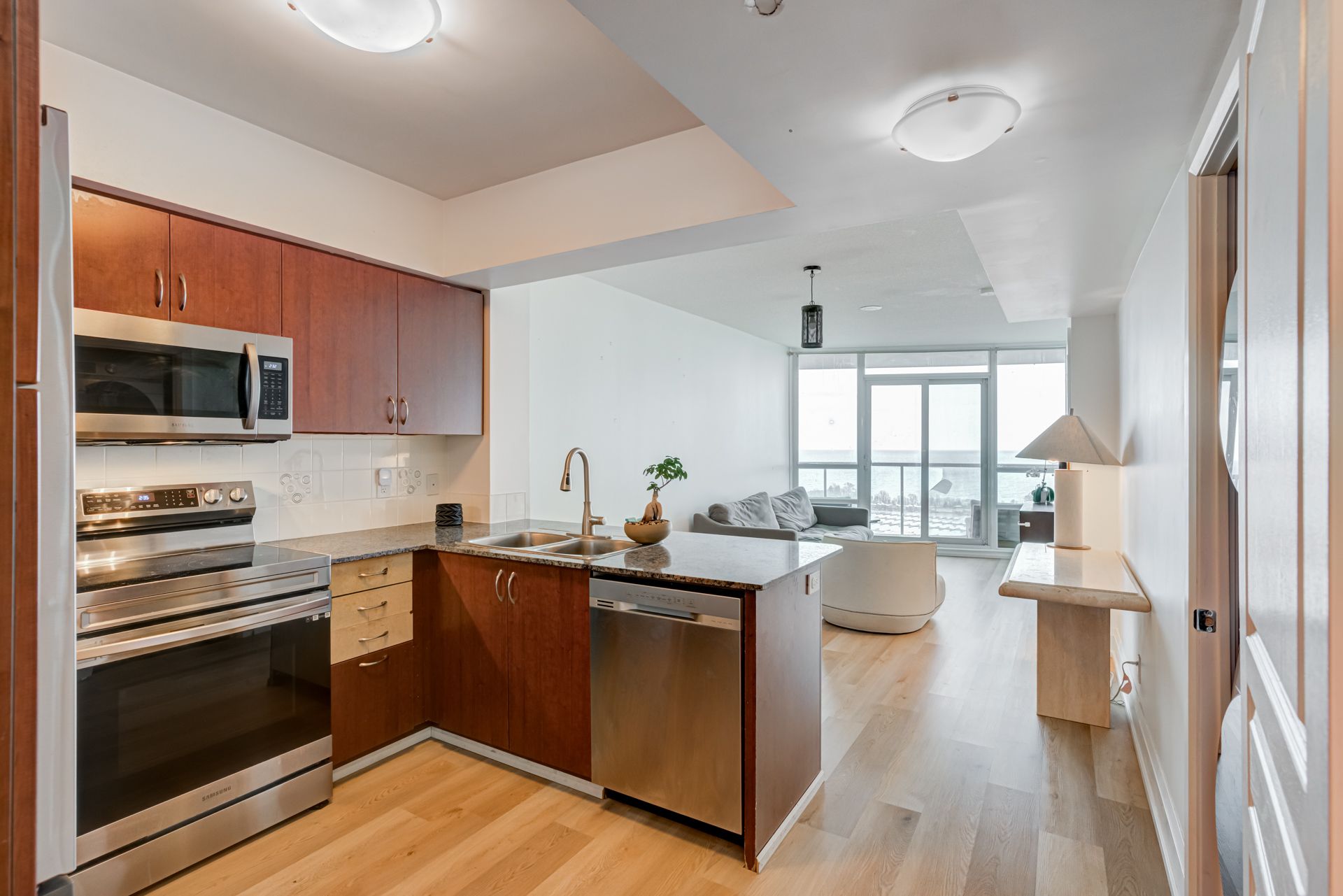 Bright & Spacious 1+Den Condo With 1 Bath In A Highly Sought-After Location! Functional Layout With Open Concept Living/Dining Area & Floor-To-Ceiling Windows Offering Breathtaking Views. Walk Out To A Beautiful Balcony With Gorgeous Lake & Sky Line Views- Perfect For Morning Coffee Or Evening Sunsets. Spacious Kitchen With 1 Year Old Stainless Steel Appliances & Ample Cabinet Space. Custom California Closets In Principle Bedroom & Front Hall. Large Den Perfect For Home Office Or Guest Space. Conveniently Located Steps To Transit, Shops, Restaurants, & The Waterfront. Enjoy Urban Living At Its Finest! Landlord Will Replace Damaged Kitchen Drawer Fronts.