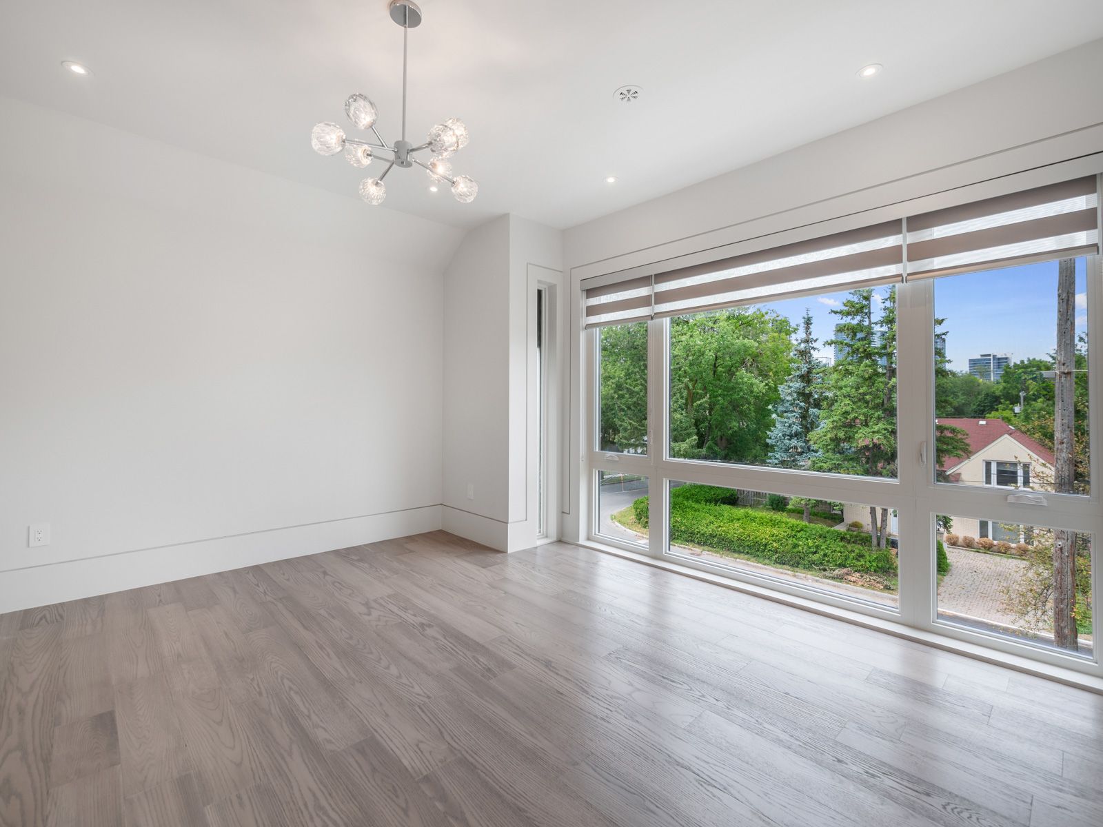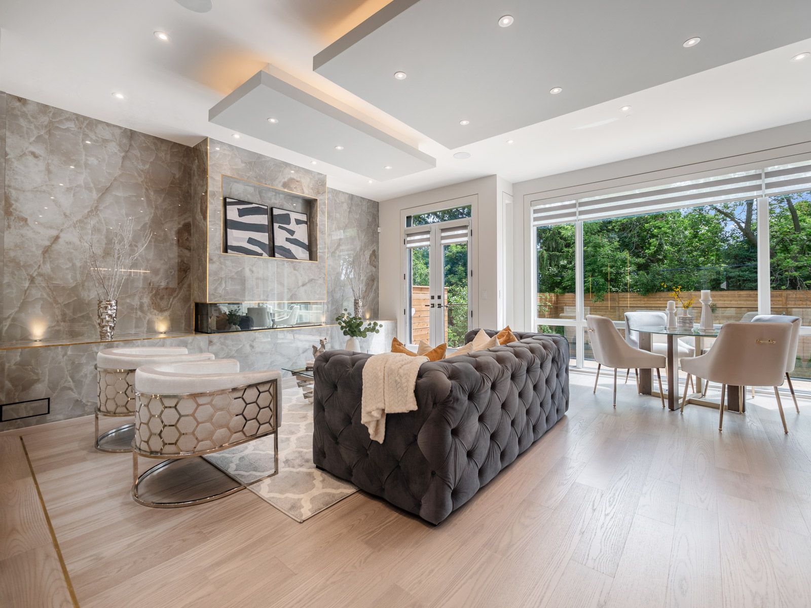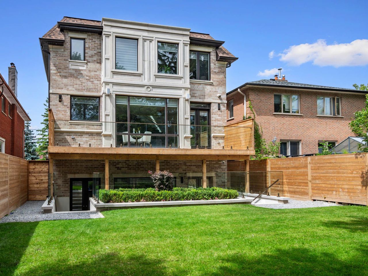Discover a masterfully crafted home, ideal for both intimate family living and hosting guests. Situated in the coveted Newtonbrook East area, this modern 4+1 bedroom residence show cases truly opulent amenities. The striking Indian Precast façade, enhanced by expert landscaping, bespoke interlock, and beautiful evening lights, makes an immediate impression. Enter into a majestic foyer and office with soaring 13' ceilings. A dramatic open-plan concept flows throughout the entire home. The spacious interior features recessed ceilings with concealed lighting, custom chandeliers, massive windows, sleek linear fireplaces, and brass details one very level, radiating pure elegance. A showcase wine cellar and tailored hardwood flooring with brass inlays add to the charm. The gourmet kitchen is a culinary paradise, fitted with premium integrated appliances. The family room, finished with Italian porcelain, recessed ceilings, and pot lights, opens to a large wooden deck overlooking the yard, perfect for gatherings. Climb the specially designed staircase with its glass banister, huge skylight, and large window that fills the space with sunlight. Find the graceful, south-oriented primary suite, complete with a lavish six-piece ensuite, fireplace, and a walk-in closet brightened by a skylight. Every other bedroom includes a private ensuite with Italian porcelain walls and warm floors. The spectacular lower level has towering ceilings, heated porcelain floors, and a beautiful recreation room with a wet bar, all lit by sunshine from large windows. Two separate walk-up exits and an extra nanny suite with its own closet and heated ensuite complete this level. The huge, landscaped backyard is enclosed by tall privacy fencing, creating a peaceful sanctuary. Close to excellent schools, stores, and restaurants. This property represents the pinnacle of luxury, comfort, and prime location.