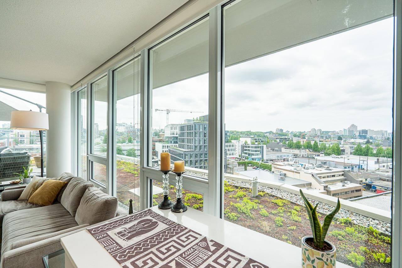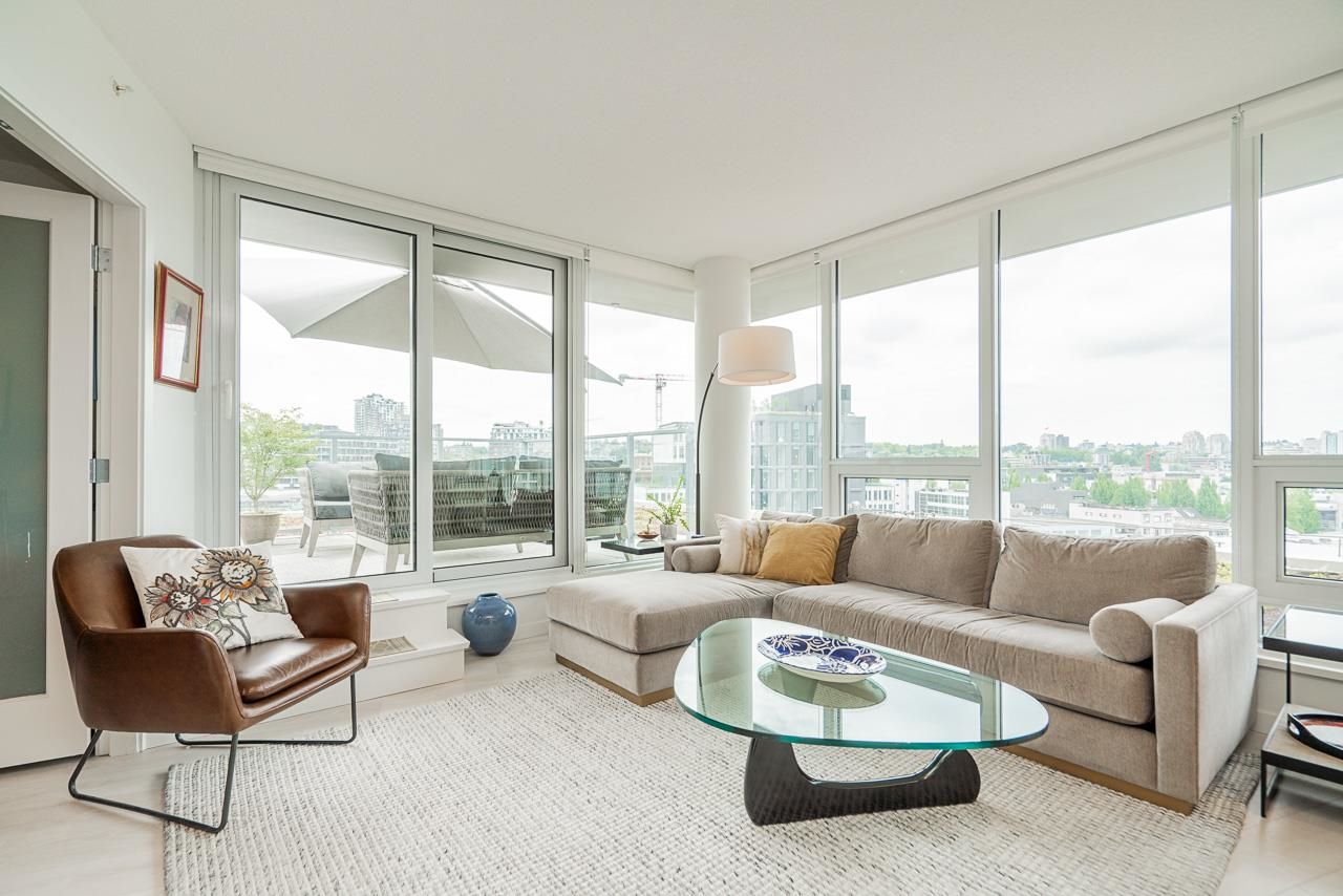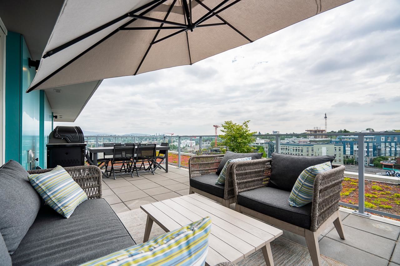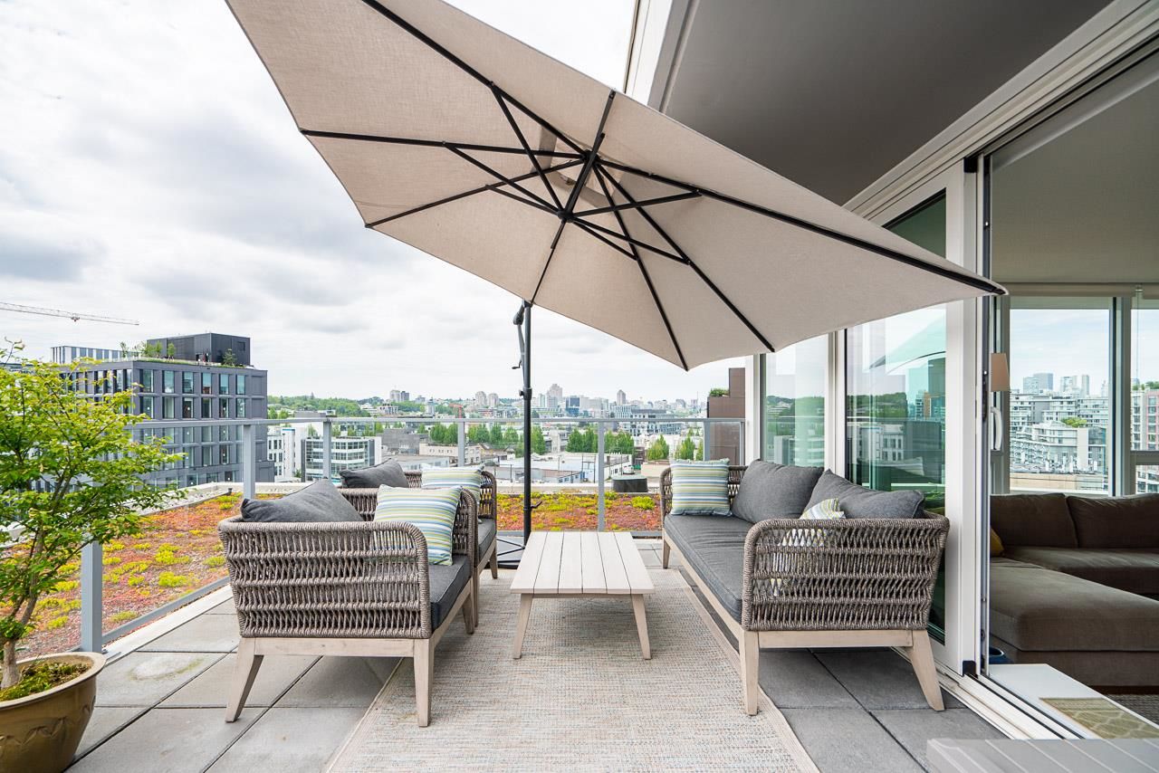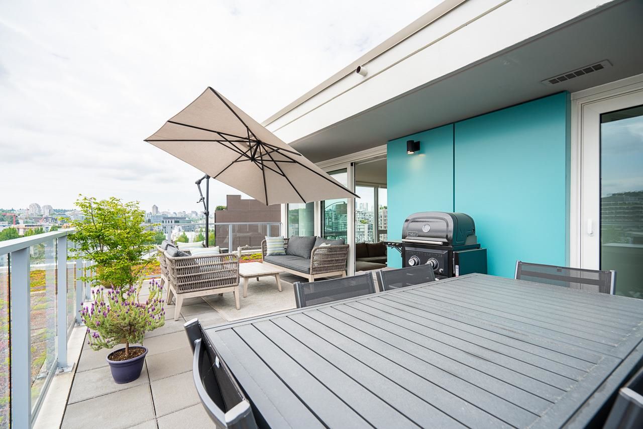 SECOND + MAIN! SUB-PENTHOUSE 2 Bed + 2 Bath + Den + interior storage room. This SOUTHWEST CORNER unit is one of the premier homes in the buildings. Featuring 180 degree south, west, and east facing VIEWs. RARE 280 square foot BALCONY. Luxury finishes including: custom European designed kitchen w/induction range top; bathrooms w/ premium fixtures; large floor to ceiling windows; wide plank hardwood flooring; custom bedroom storage; and A/C. 2 parking stalls. Building amenities include: rooftop terrace with great views, bbq area, urban rooftop gardens, fitness room, party room with full kitchen. Minutes walk to SkyTrain, False Creek, Olympic Village shops, restaurants, bars and seawall. 2-5-10 warranty. Short-term rental allowed. Superb location.