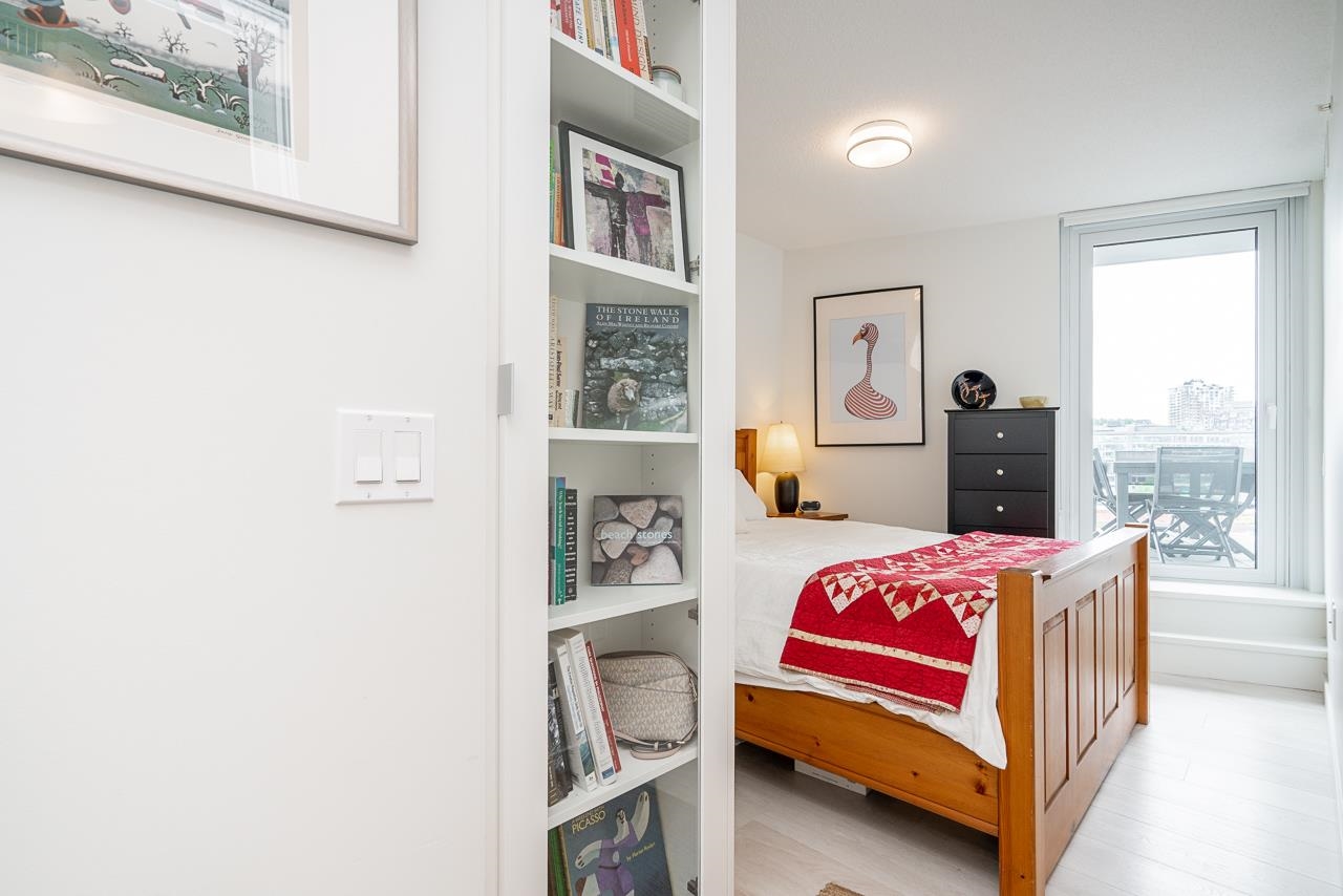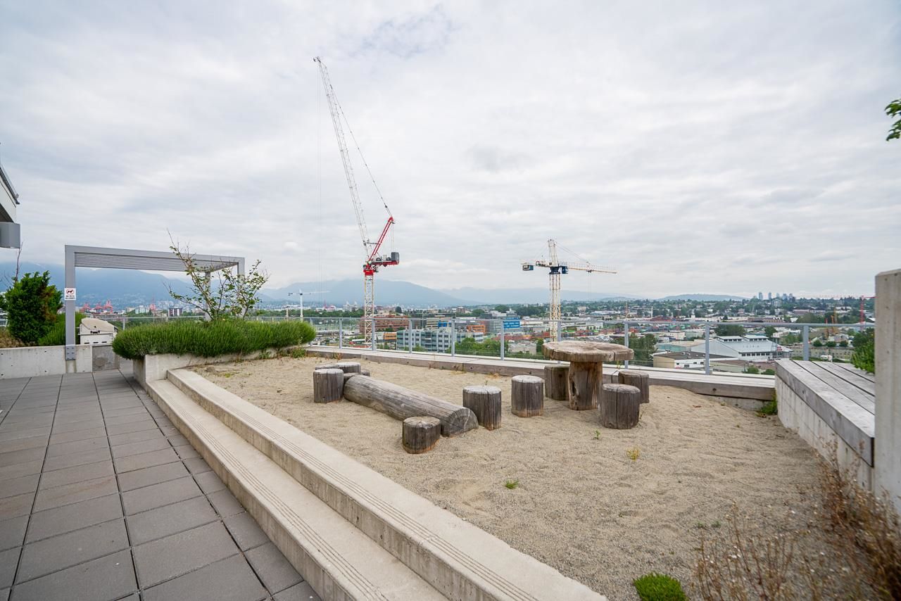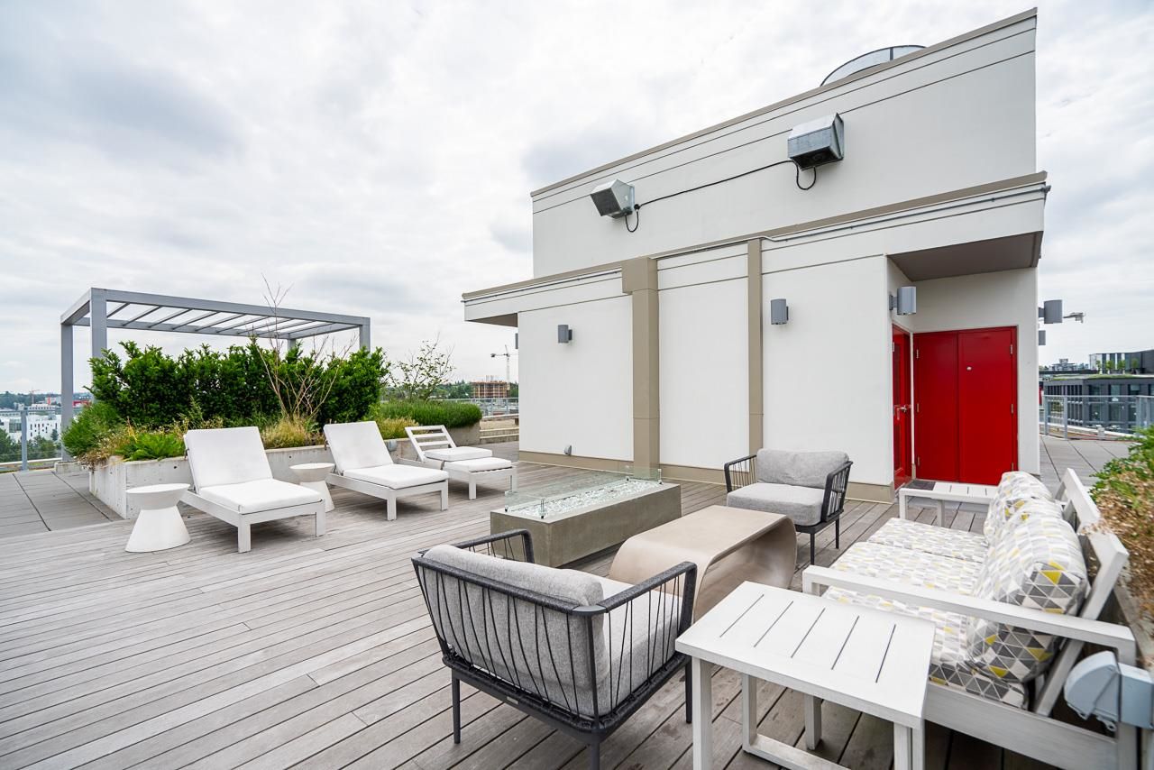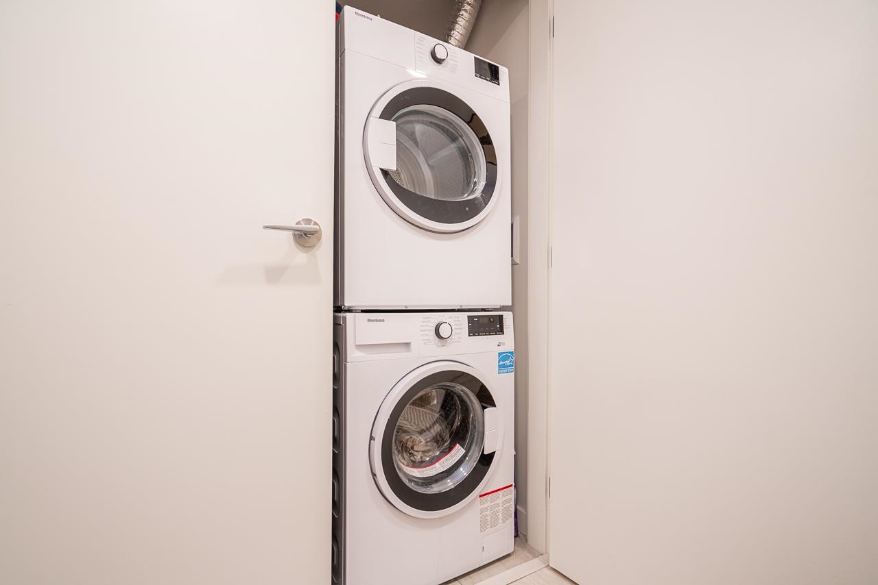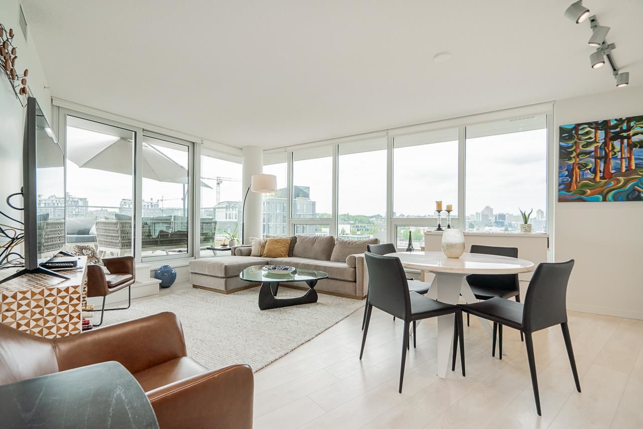 SECOND + MAIN! SUB-PENTHOUSE 2 Bed + 2 Bath + Den + interior storage room. This SOUTHWEST CORNER unit is one of the premier homes in the buildings. Featuring 180 degree south, west, and east facing VIEWs. RARE 280 square foot BALCONY. Luxury finishes including: custom European designed kitchen w/induction range top; bathrooms w/ premium fixtures; large floor to ceiling windows; wide plank hardwood flooring; custom bedroom storage; and A/C. 2 parking stalls. Building amenities include: rooftop terrace with great views, bbq area, urban rooftop gardens, fitness room, party room with full kitchen. Minutes walk to SkyTrain, False Creek, Olympic Village shops, restaurants, bars and seawall. 2-5-10 warranty. Short-term rental allowed. Superb location.