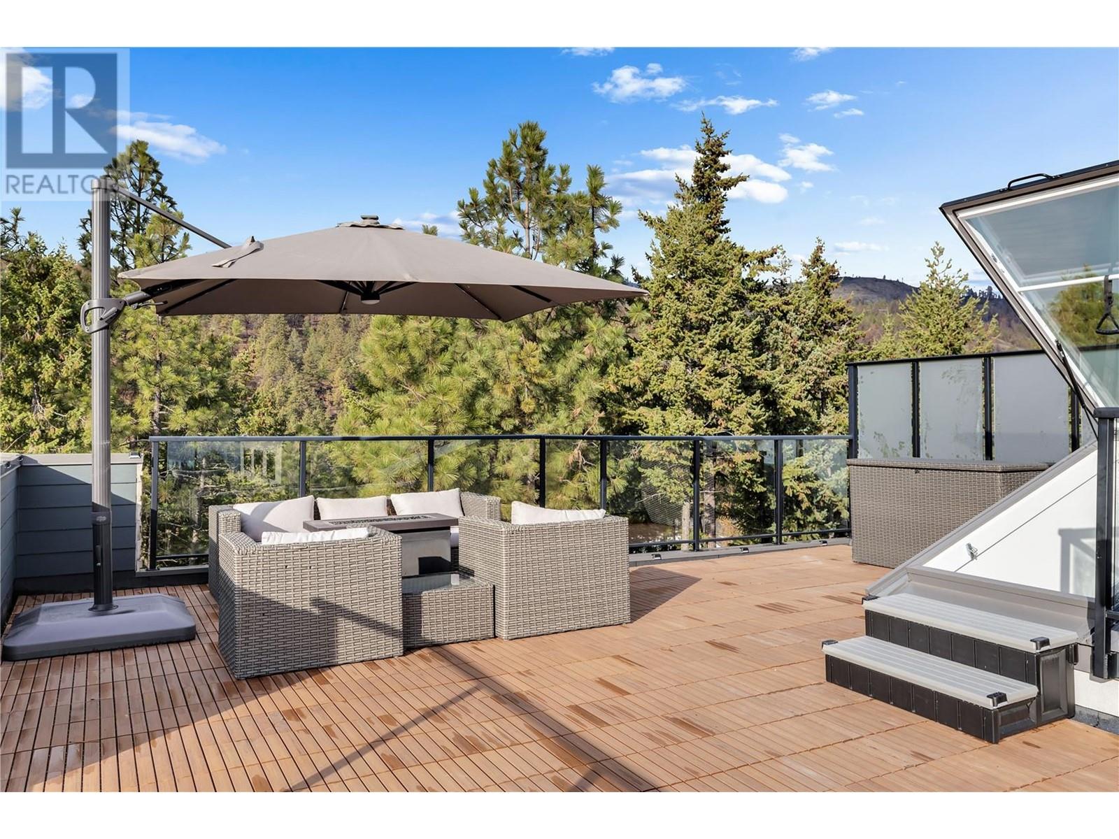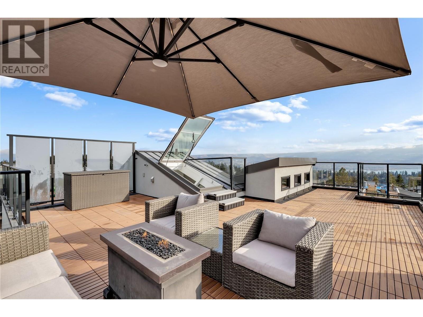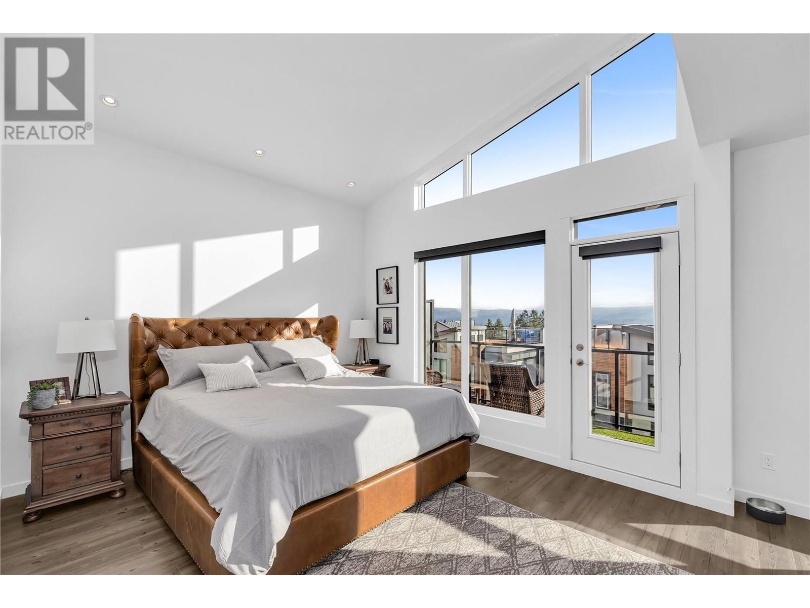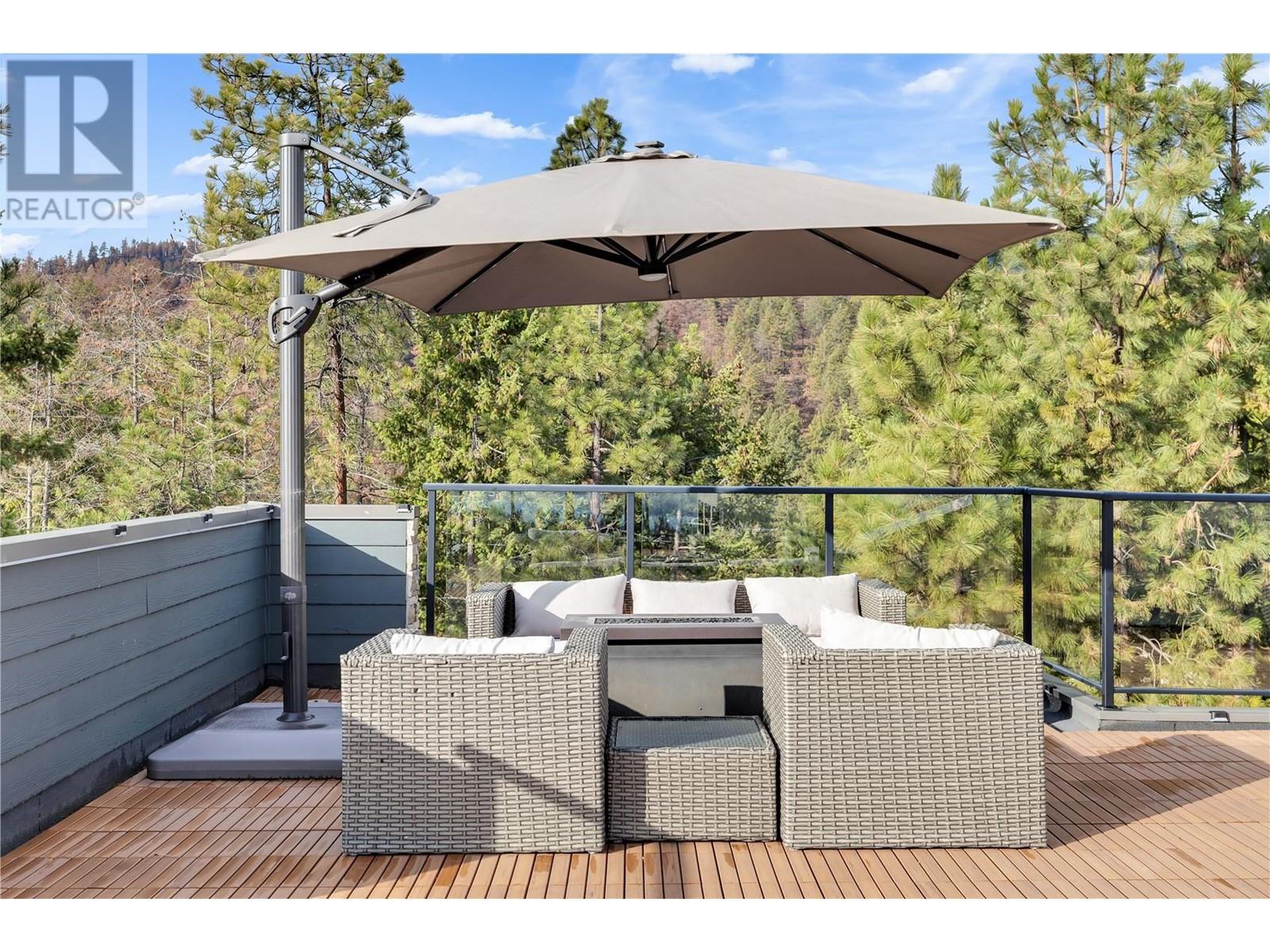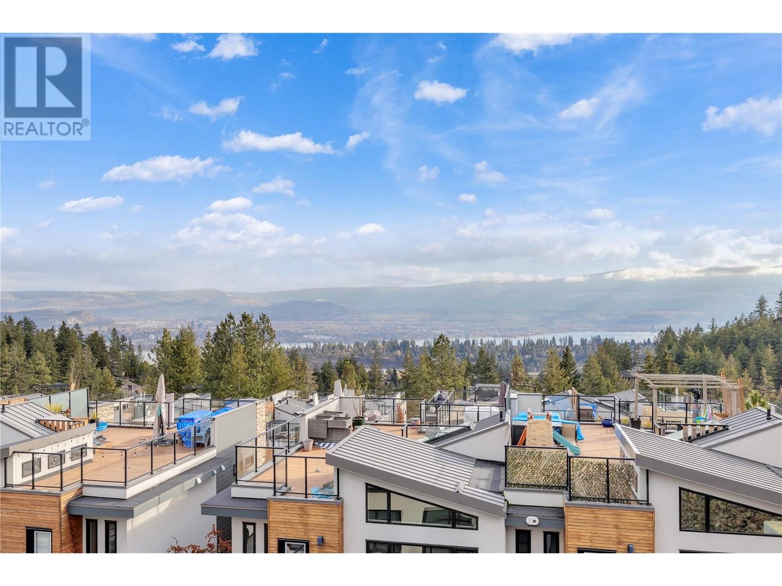 Step into this captivating 3-bedroom, 3-bathroom multilevel home nestled within Lakeview Terrace, boasting stunning panoramic views of Okanagan Lake from its sprawling rooftop patio. Bathed in natural light from its large windows, this residence spans an impressive 1100 sqft of outdoor living space across three decks, offering an idyllic setting for entertaining and relaxation. The main floor welcomes you with an open concept layout encompassing the living and dining areas, complemented by a deck extending seamlessly from the living room. The kitchen, featuring an oversized island with quartz counters, updated appliances, and a gas range, embodies both style and functionality, enhanced by under-cabinet lighting. Ascending to the upper level, discover two bedrooms sharing a full bathroom. The master suite, adorned with vaulted ceilings and transom windows, boasts a walk-in closet, a luxurious ensuite with double sinks, a walk-in shower, and a private deck. The fully finished lower level is a versatile space, perfect for a home theatre, rec room, or man cave, offering flexibility for various lifestyle needs. A generously sized double garage with built-in shelving provides ample storage. (id:22211)