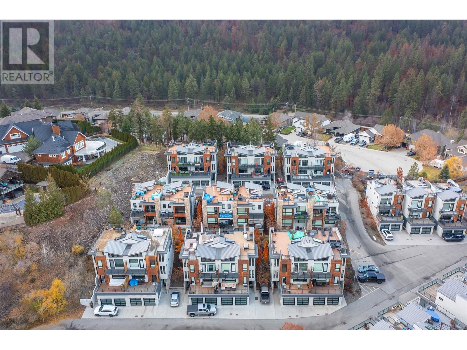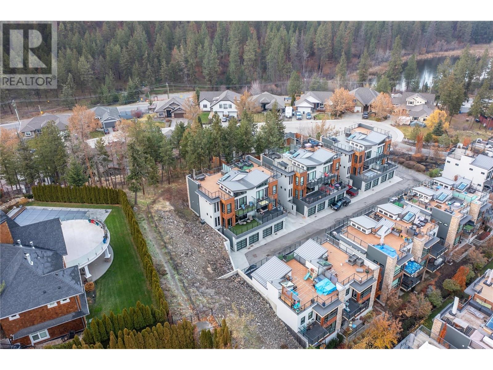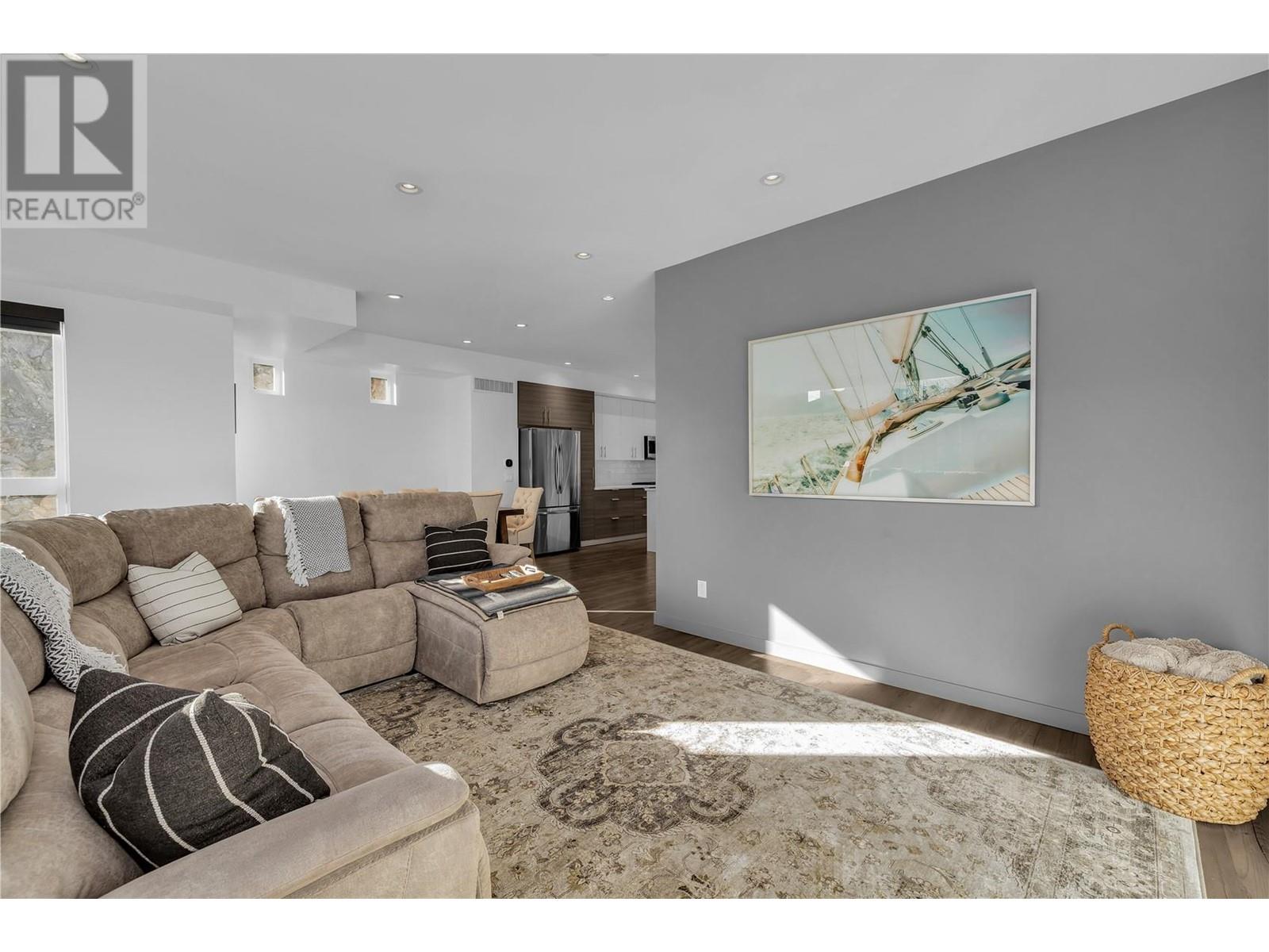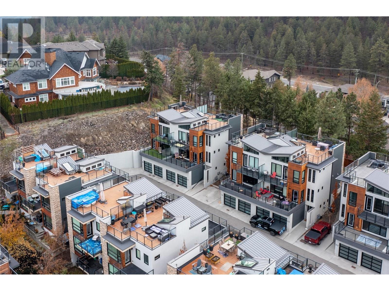 Step into this captivating 3-bedroom, 3-bathroom multilevel home nestled within Lakeview Terrace, boasting stunning panoramic views of Okanagan Lake from its sprawling rooftop patio. Bathed in natural light from its large windows, this residence spans an impressive 1100 sqft of outdoor living space across three decks, offering an idyllic setting for entertaining and relaxation. The main floor welcomes you with an open concept layout encompassing the living and dining areas, complemented by a deck extending seamlessly from the living room. The kitchen, featuring an oversized island with quartz counters, updated appliances, and a gas range, embodies both style and functionality, enhanced by under-cabinet lighting. Ascending to the upper level, discover two bedrooms sharing a full bathroom. The master suite, adorned with vaulted ceilings and transom windows, boasts a walk-in closet, a luxurious ensuite with double sinks, a walk-in shower, and a private deck. The fully finished lower level is a versatile space, perfect for a home theatre, rec room, or man cave, offering flexibility for various lifestyle needs. A generously sized double garage with built-in shelving provides ample storage. (id:22211)