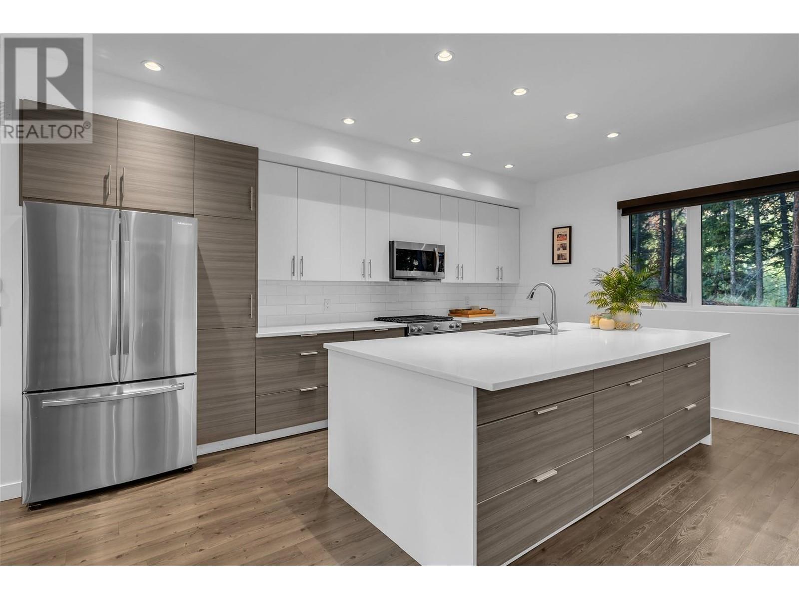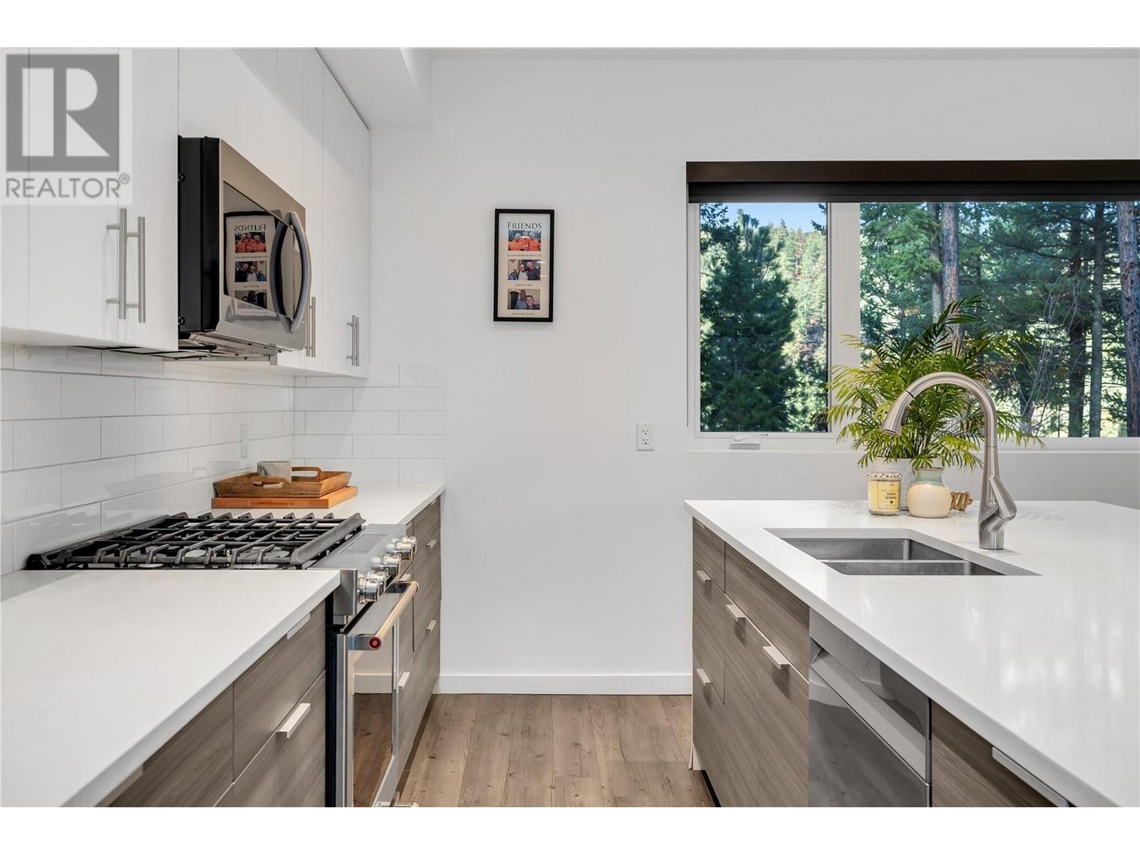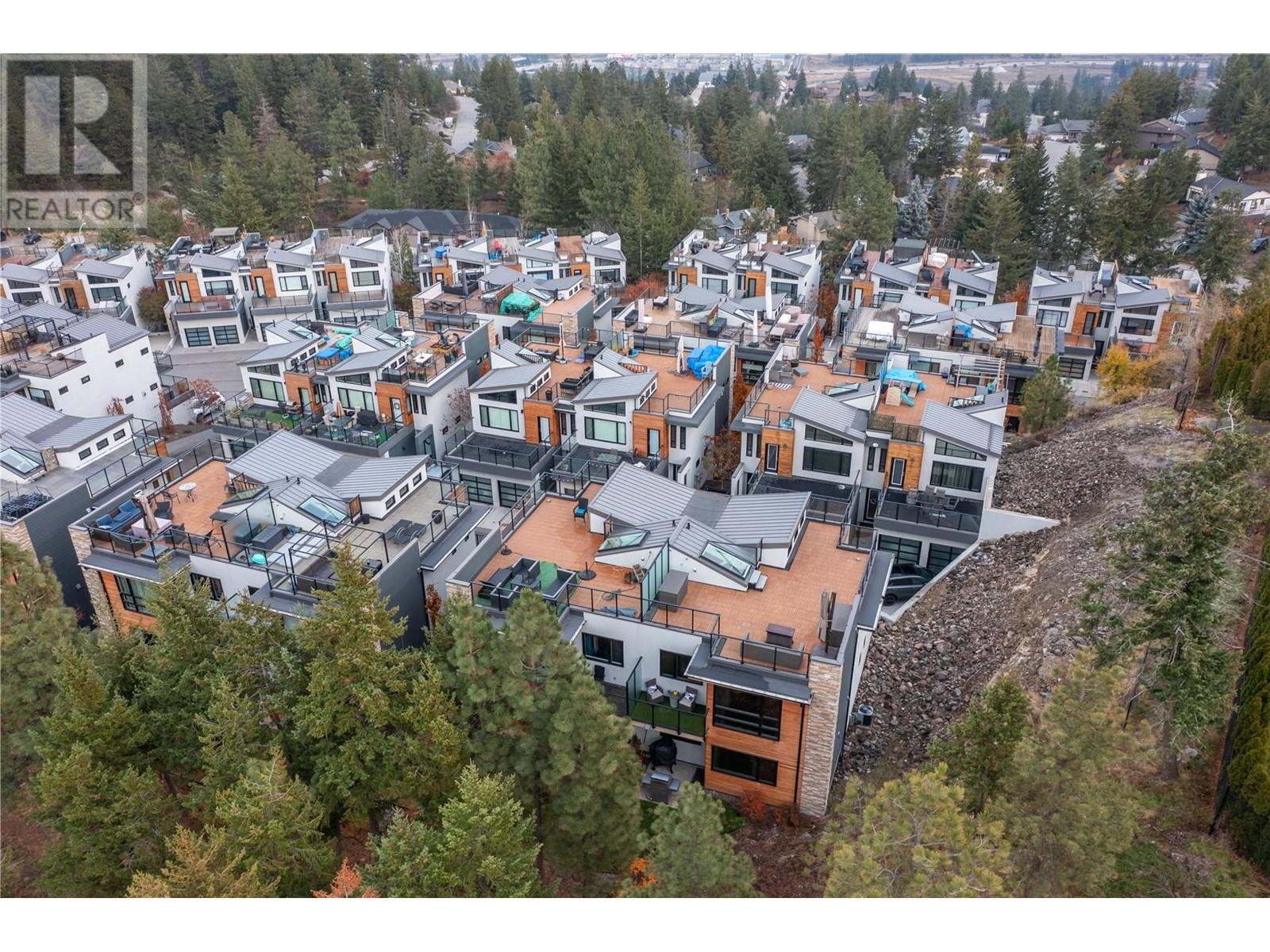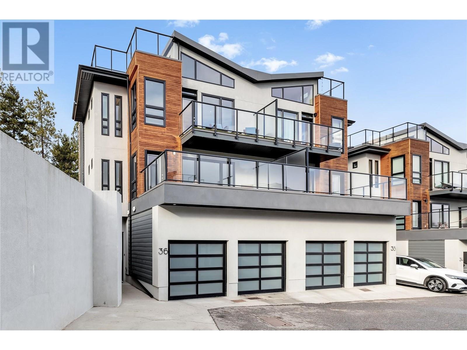 Step into this captivating 3-bedroom, 3-bathroom multilevel home nestled within Lakeview Terrace, boasting stunning panoramic views of Okanagan Lake from its sprawling rooftop patio. Bathed in natural light from its large windows, this residence spans an impressive 1100 sqft of outdoor living space across three decks, offering an idyllic setting for entertaining and relaxation. The main floor welcomes you with an open concept layout encompassing the living and dining areas, complemented by a deck extending seamlessly from the living room. The kitchen, featuring an oversized island with quartz counters, updated appliances, and a gas range, embodies both style and functionality, enhanced by under-cabinet lighting. Ascending to the upper level, discover two bedrooms sharing a full bathroom. The master suite, adorned with vaulted ceilings and transom windows, boasts a walk-in closet, a luxurious ensuite with double sinks, a walk-in shower, and a private deck. The fully finished lower level is a versatile space, perfect for a home theatre, rec room, or man cave, offering flexibility for various lifestyle needs. A generously sized double garage with built-in shelving provides ample storage. (id:22211)