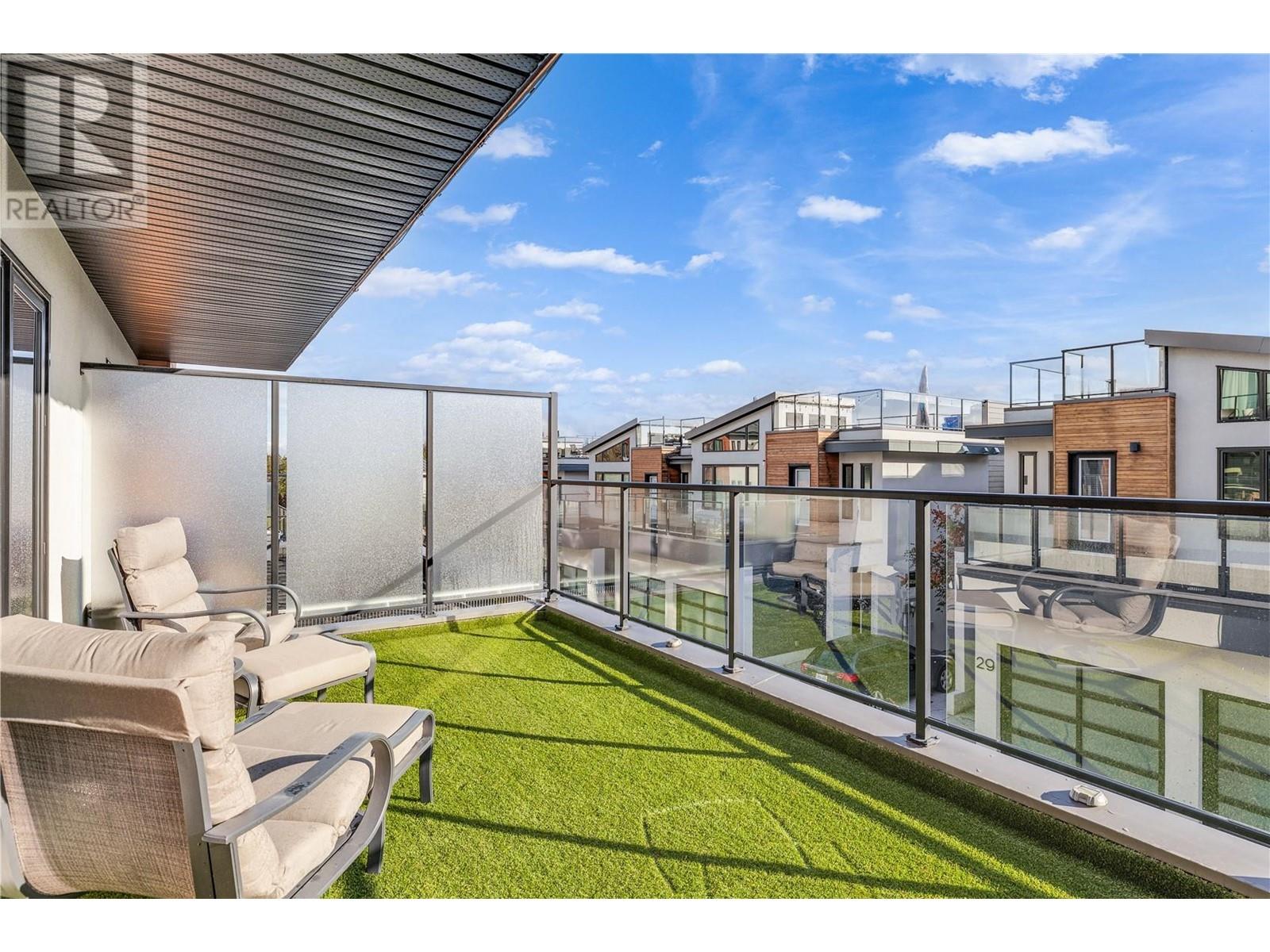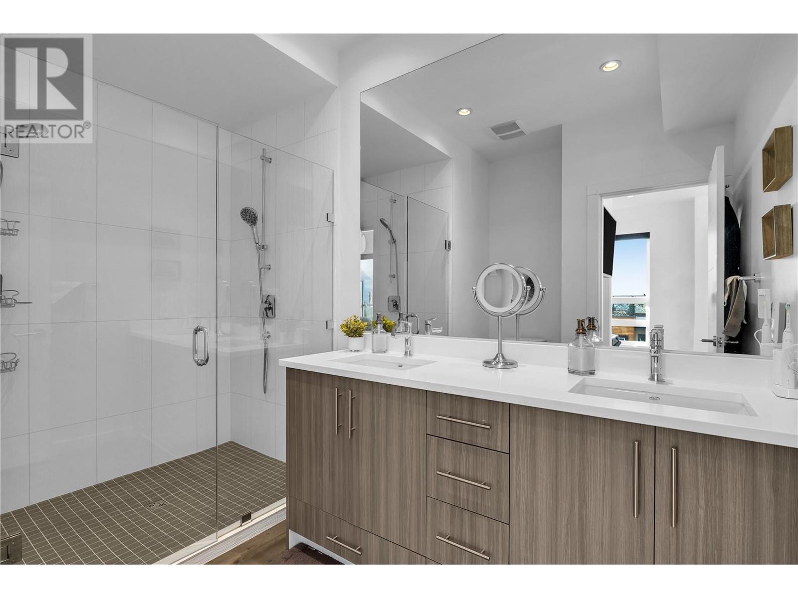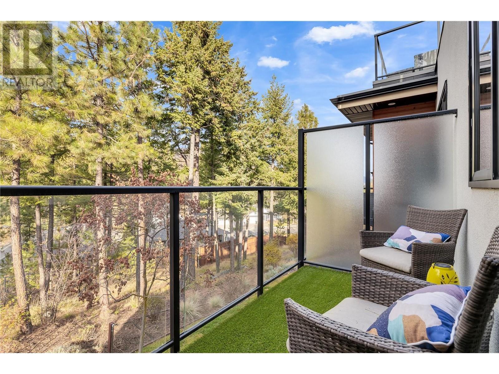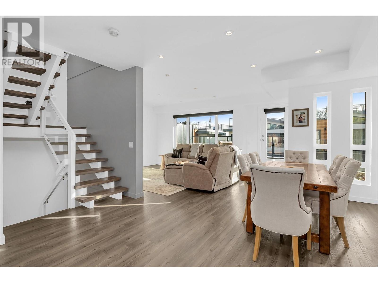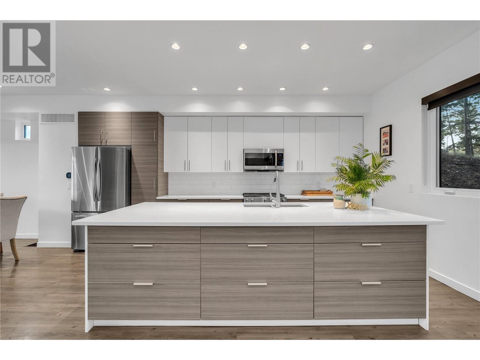 Step into this captivating 3-bedroom, 3-bathroom multilevel home nestled within Lakeview Terrace, boasting stunning panoramic views of Okanagan Lake from its sprawling rooftop patio. Bathed in natural light from its large windows, this residence spans an impressive 1100 sqft of outdoor living space across three decks, offering an idyllic setting for entertaining and relaxation. The main floor welcomes you with an open concept layout encompassing the living and dining areas, complemented by a deck extending seamlessly from the living room. The kitchen, featuring an oversized island with quartz counters, updated appliances, and a gas range, embodies both style and functionality, enhanced by under-cabinet lighting. Ascending to the upper level, discover two bedrooms sharing a full bathroom. The master suite, adorned with vaulted ceilings and transom windows, boasts a walk-in closet, a luxurious ensuite with double sinks, a walk-in shower, and a private deck. The fully finished lower level is a versatile space, perfect for a home theatre, rec room, or man cave, offering flexibility for various lifestyle needs. A generously sized double garage with built-in shelving provides ample storage. (id:22211)