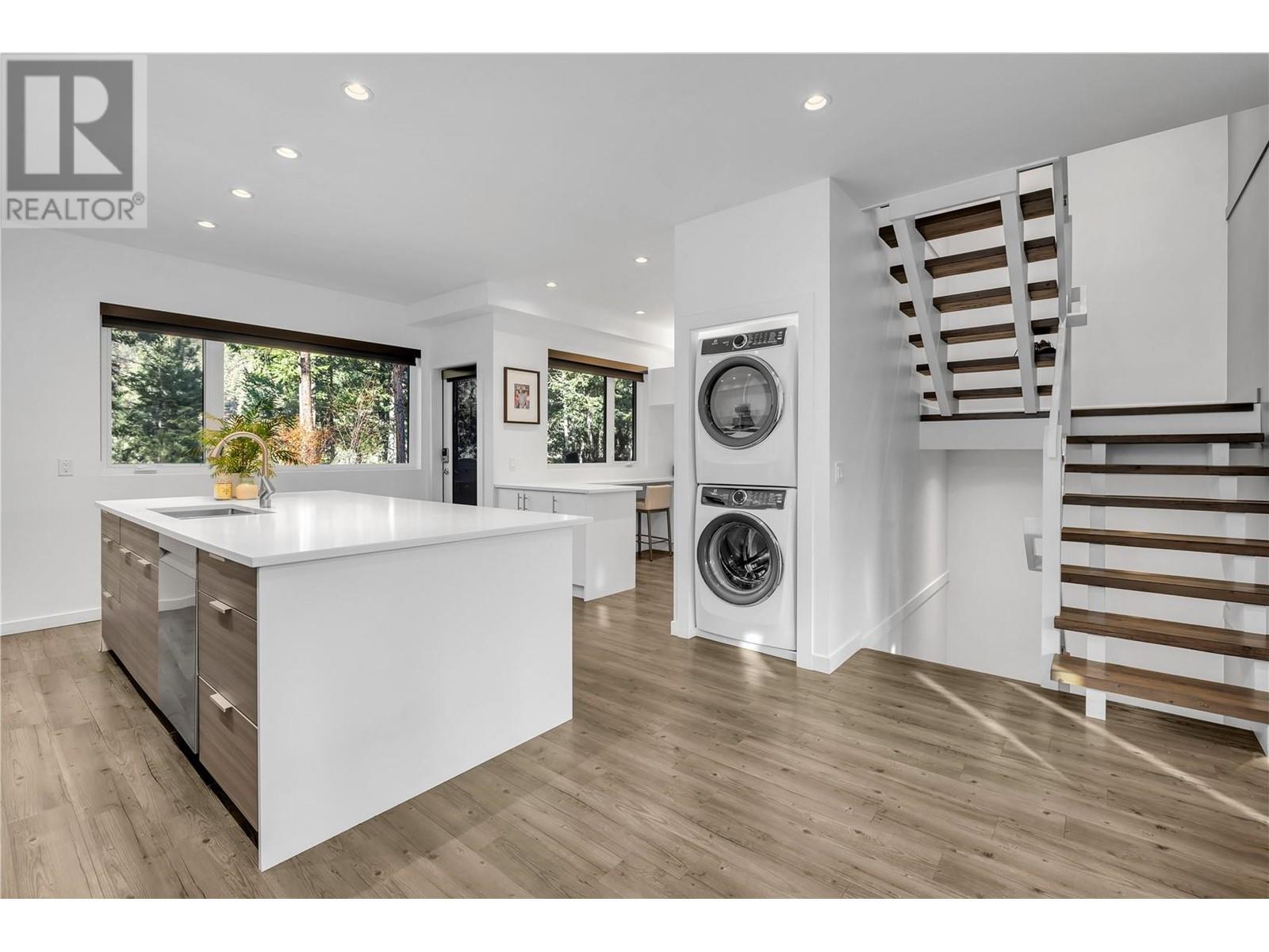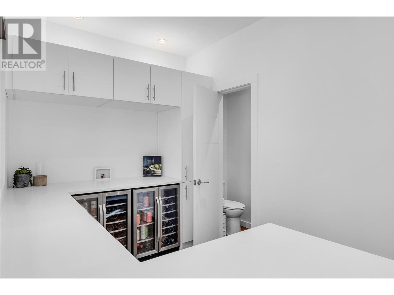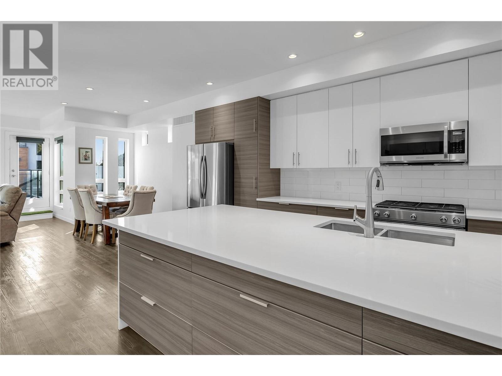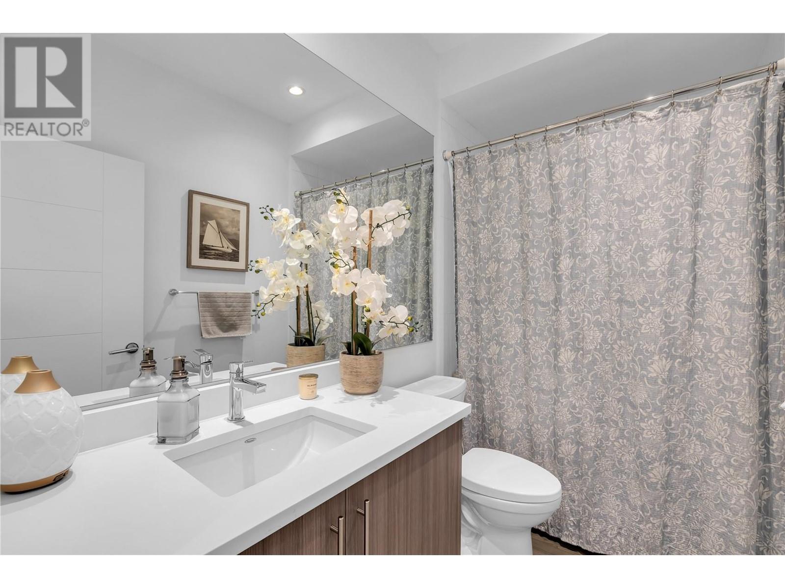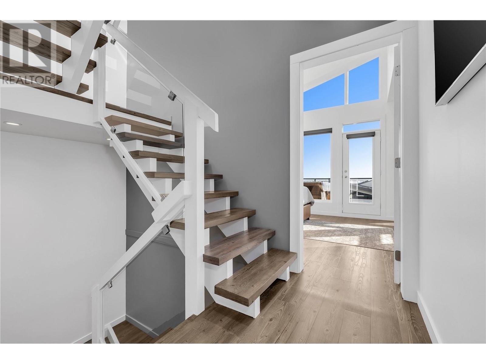 Step into this captivating 3-bedroom, 3-bathroom multilevel home nestled within Lakeview Terrace, boasting stunning panoramic views of Okanagan Lake from its sprawling rooftop patio. Bathed in natural light from its large windows, this residence spans an impressive 1100 sqft of outdoor living space across three decks, offering an idyllic setting for entertaining and relaxation. The main floor welcomes you with an open concept layout encompassing the living and dining areas, complemented by a deck extending seamlessly from the living room. The kitchen, featuring an oversized island with quartz counters, updated appliances, and a gas range, embodies both style and functionality, enhanced by under-cabinet lighting. Ascending to the upper level, discover two bedrooms sharing a full bathroom. The master suite, adorned with vaulted ceilings and transom windows, boasts a walk-in closet, a luxurious ensuite with double sinks, a walk-in shower, and a private deck. The fully finished lower level is a versatile space, perfect for a home theatre, rec room, or man cave, offering flexibility for various lifestyle needs. A generously sized double garage with built-in shelving provides ample storage. (id:22211)